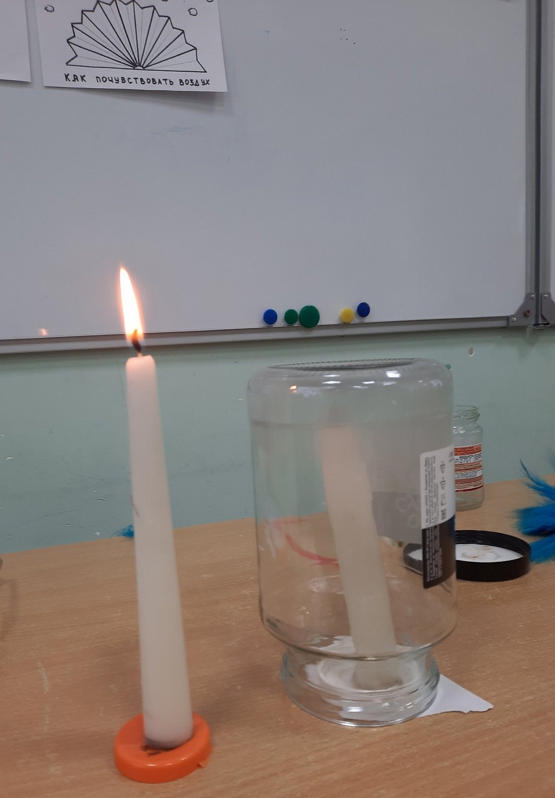 Брали две свечи, зажигали их. Одну свечу накрывали стеклянной банкой, и наблюдали, что происходит.
