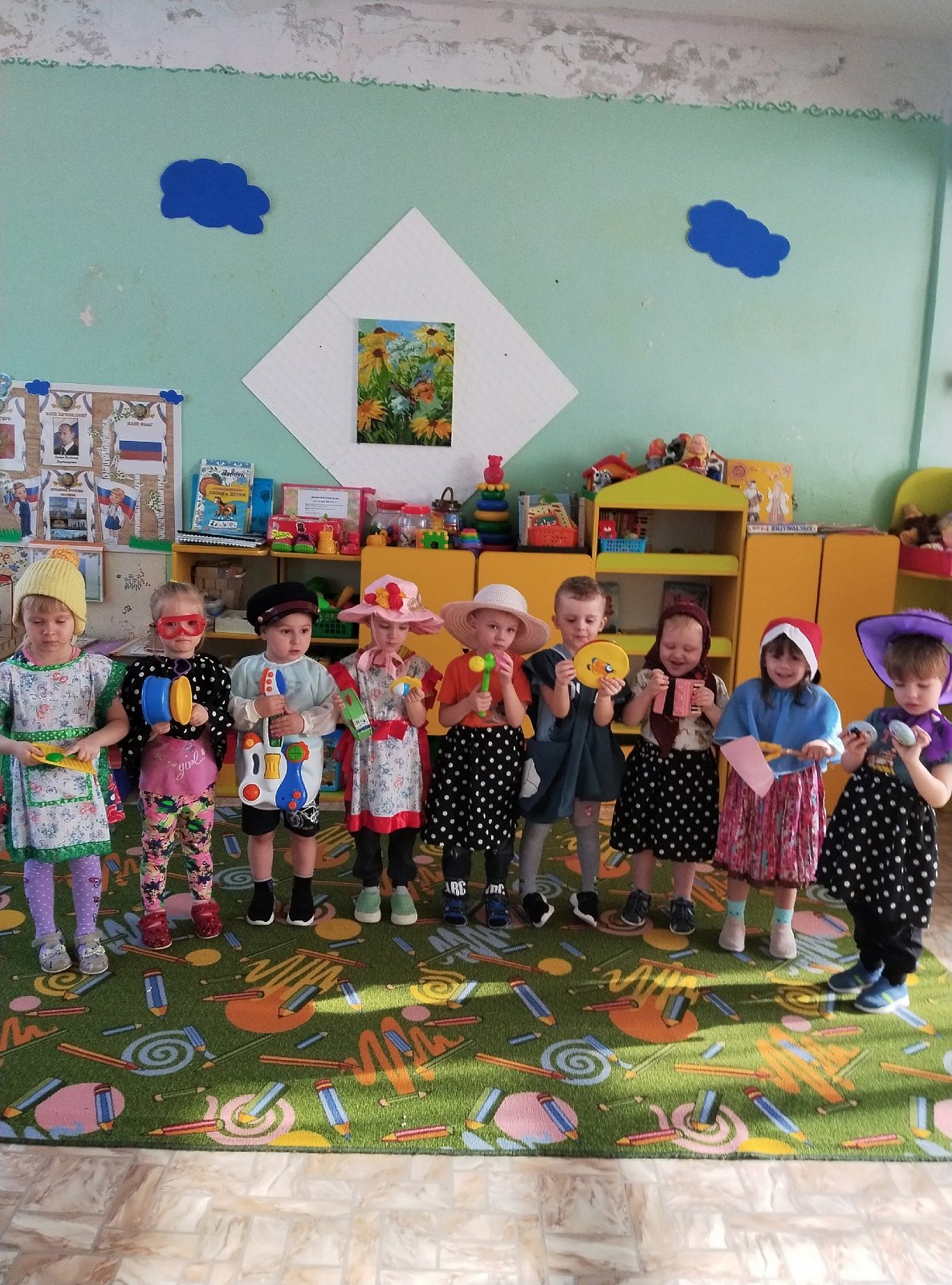 Ребятки младших групп подняли себе настроение весёлым переодеванием; с удовольствием участвовали в эстафетах; играли с веселыми мячами и разноцветными кеглями!