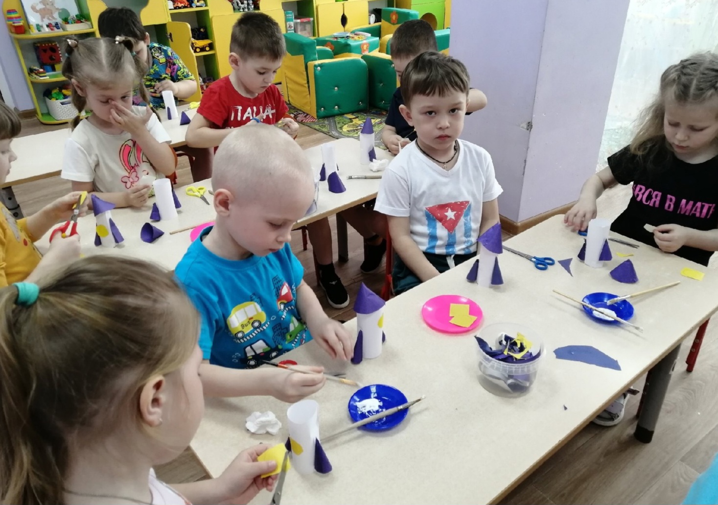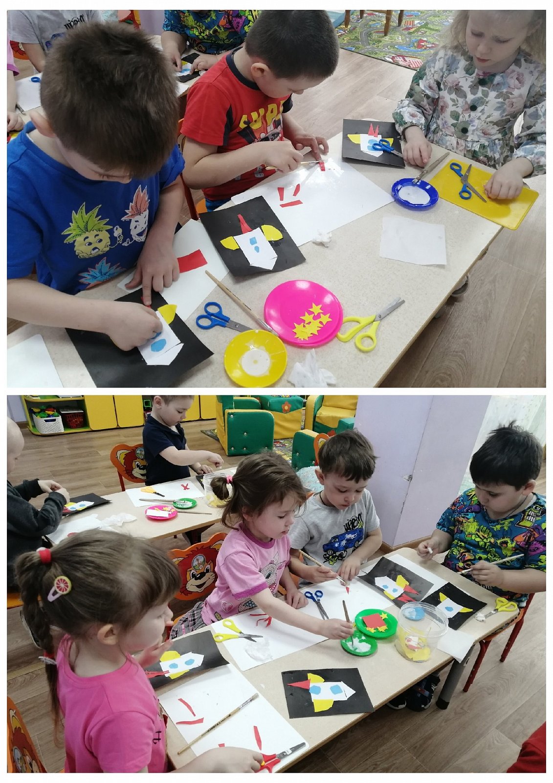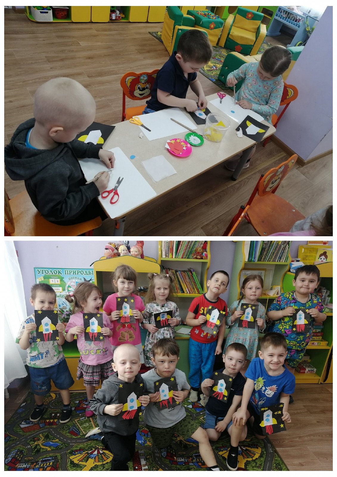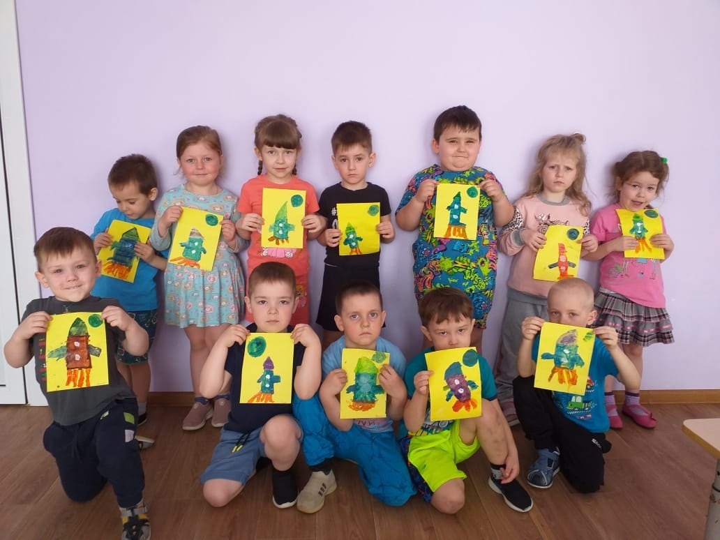Полученные знания о космосе, о космических кораблях дети изобразили в художественном творчестве: рисовали и конструировали, выполнили аппликацию "Ракеты".