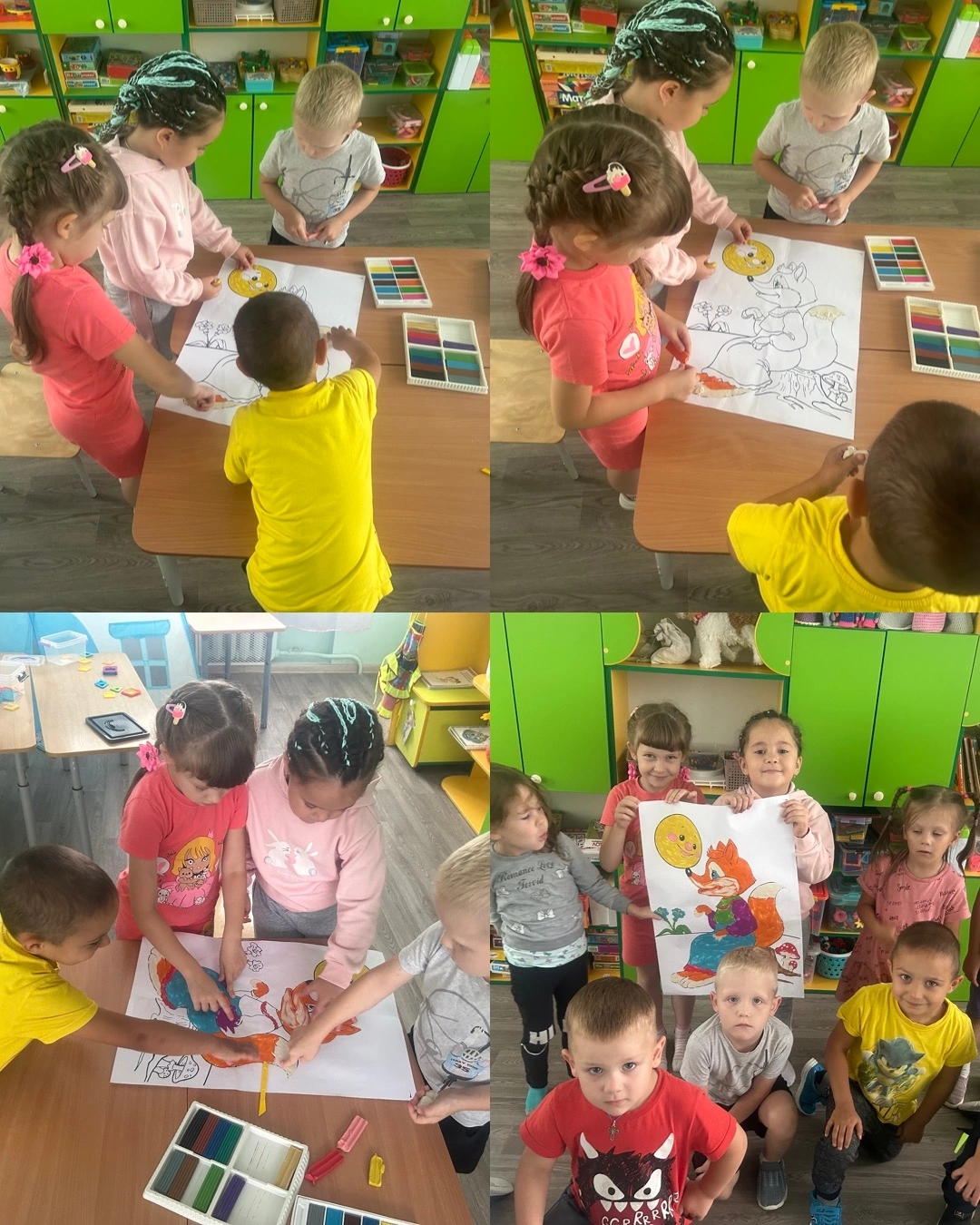 Итогом первого дня стала коллективная пластилинография по сказке «Колобок».