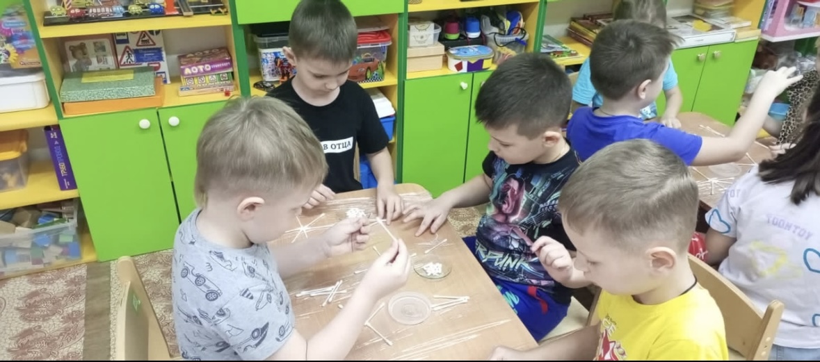 В творческой деятельности по лепке "Украсили узором варежки ", учимся мастерить снежинки из ватных палочек, вырезаем снежинки из бумаги и украшаем ими окна в группе, рисуем сюжетные рисунки.