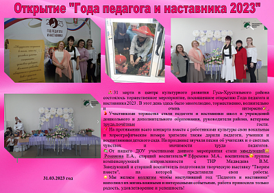 31 марта в центре культурного развития Гусь-Хрустального района состоялось торжественное мероприятие, посвященное открытию Года педагога и наставника 2023 . В этот день здесь было многолюдно, торжественно, волнительно и очень интересно.