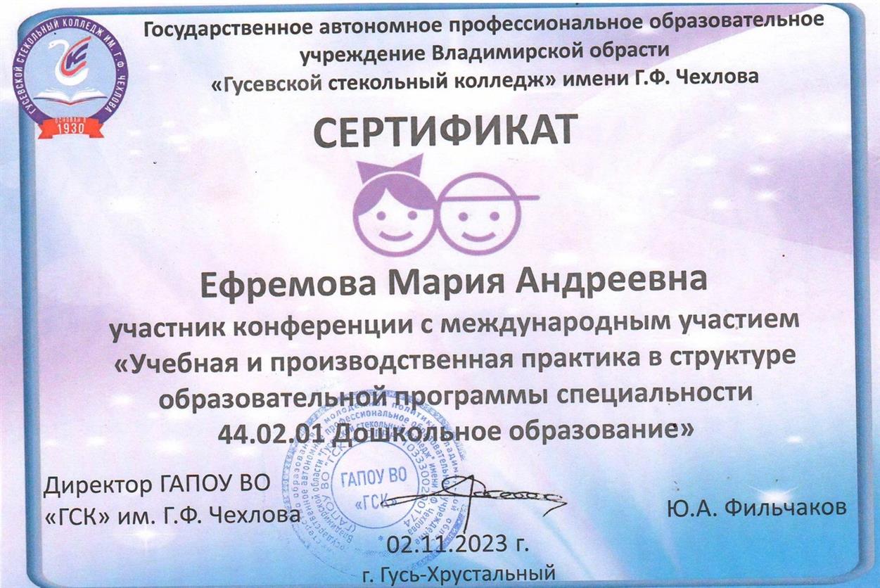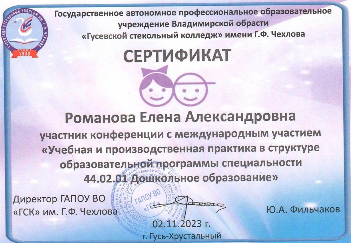 2 ноября на базе ГАПОУ ВО «Гусевской стекольный колледж» имени Г.Ф. Чехлова с целью развития продуктивного сотрудничества в области подготовки квалифицированных кадров по специальности «Дошкольное образование» состоялась конференция с международным участием «Учебная и производственная практика в структуре образовательной программы дошкольного образования».