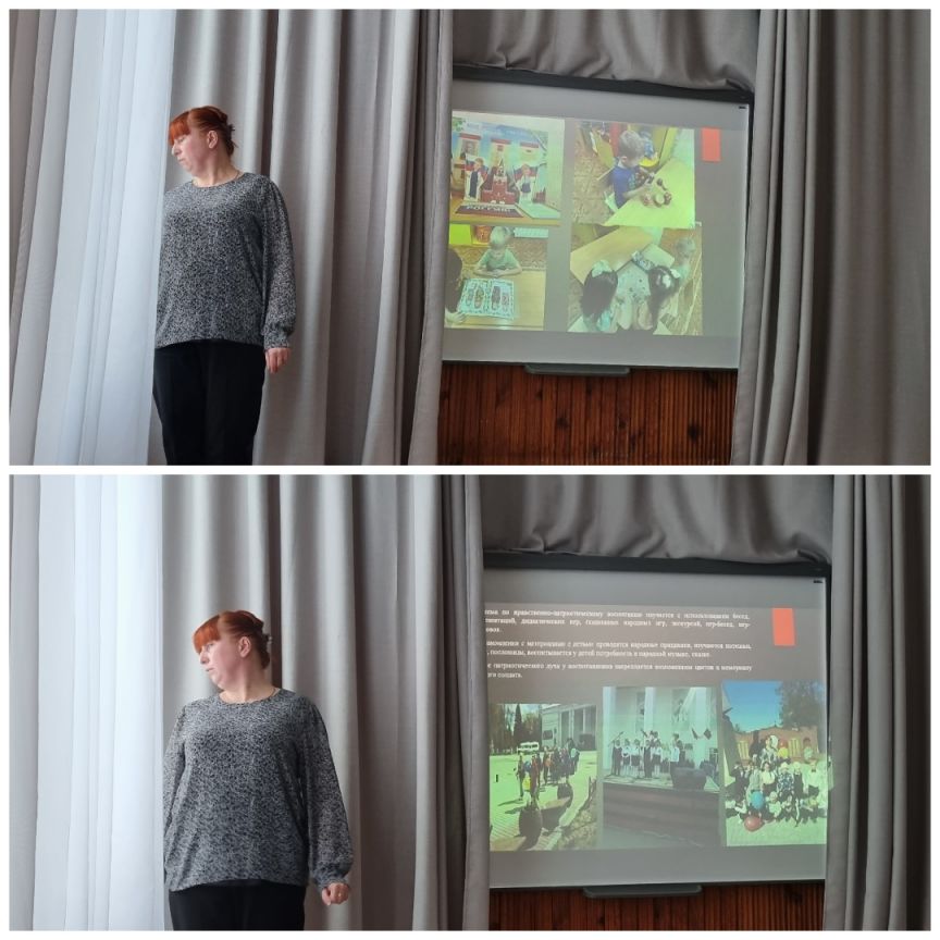 Далее выступила воспитатель Поросенкова Татьяна Алексеевна с сообщением на тему "Развивающая среда по нравственно - патриотическому воспитанию в ДОУ", где рассказала о возрастных особенностях с учётом ФОП ДО, основываясь на личном опыте.