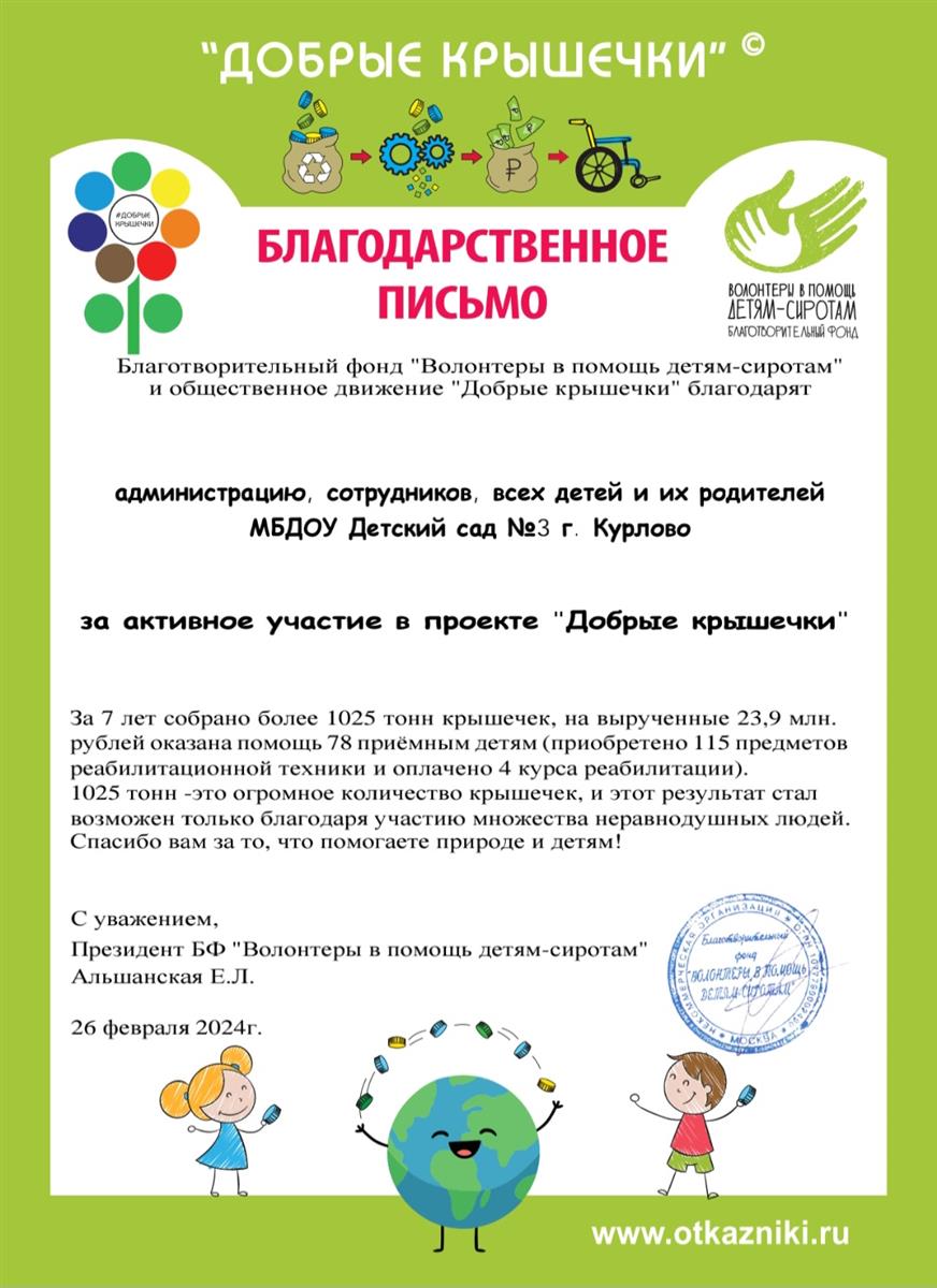«Добрые крышечки» — это российский эколого-благотворительный волонтерский проект, имеющий двойную цель: сделать наш мир чище и помочь детям, которым нужна поддержка. Проект организован совместно Общественным движением «ДОБРЫЕ КРЫШЕЧКИ» и Благотворительным фондом «Волонтеры в помощь детям-сиротам».