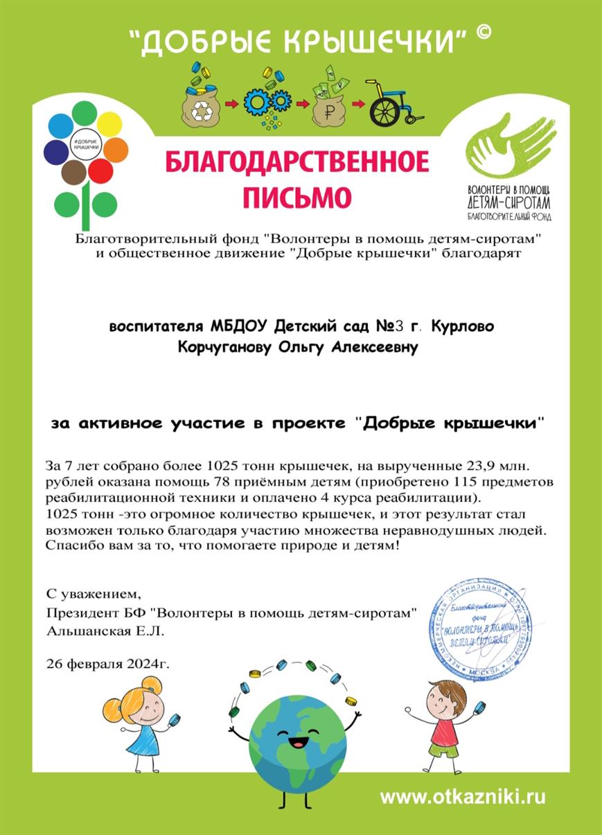 Педагог нашего детского сада Корчуганова Ольга Алексеевна, регулярно, совместно с родителями воспитанников II группы раннего возраста "Малыши" принимают активное участие в благотворительном проекте «Добрые крышечки».