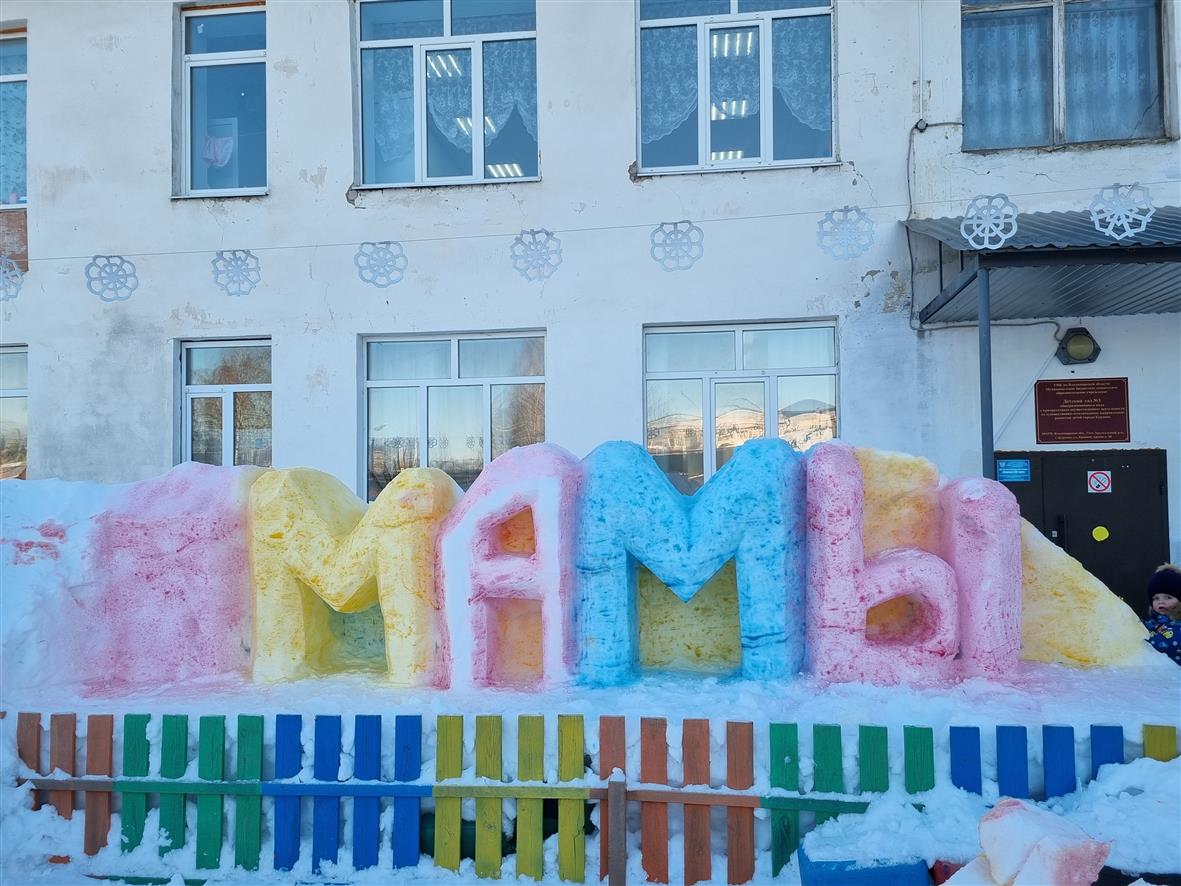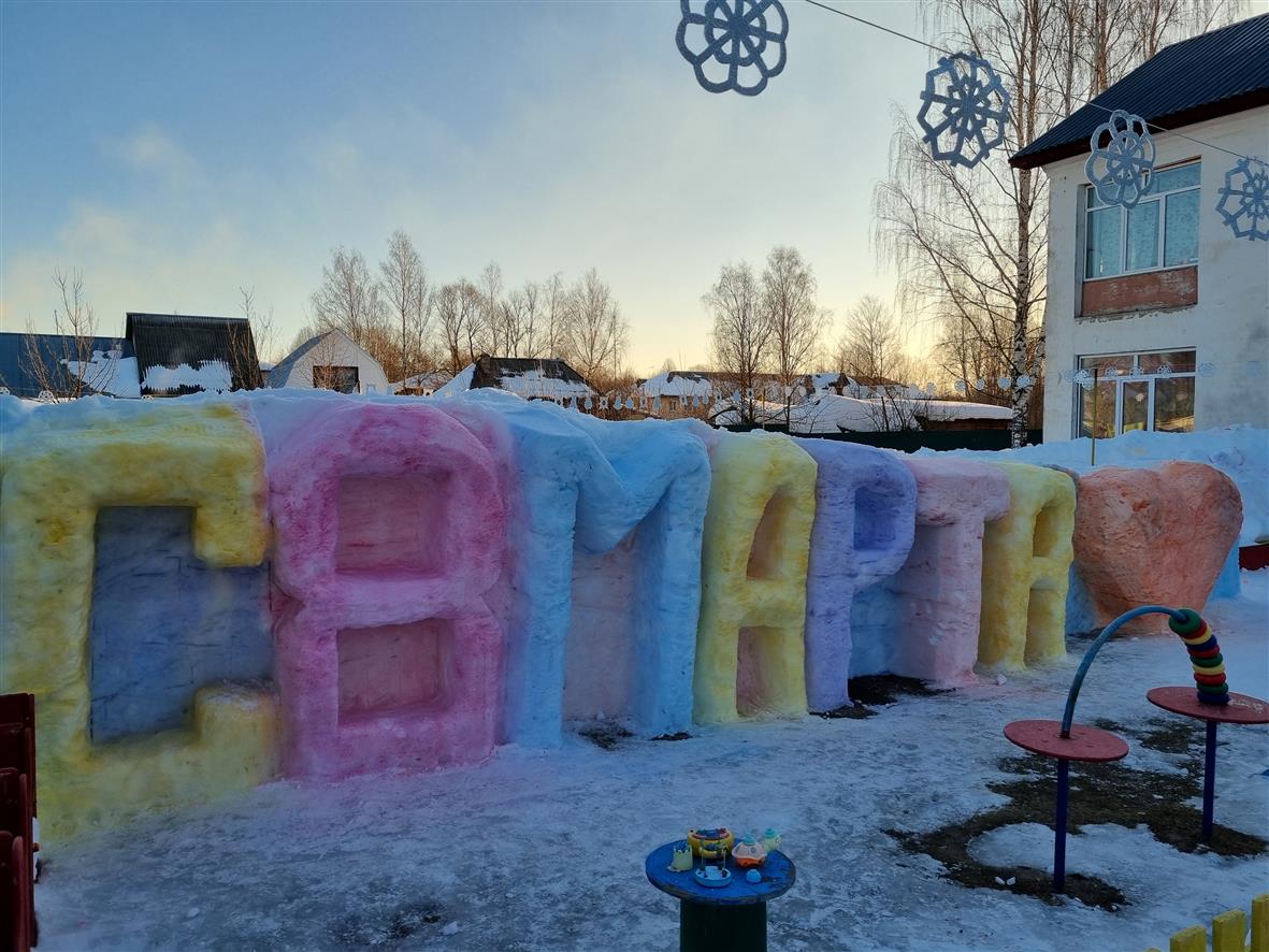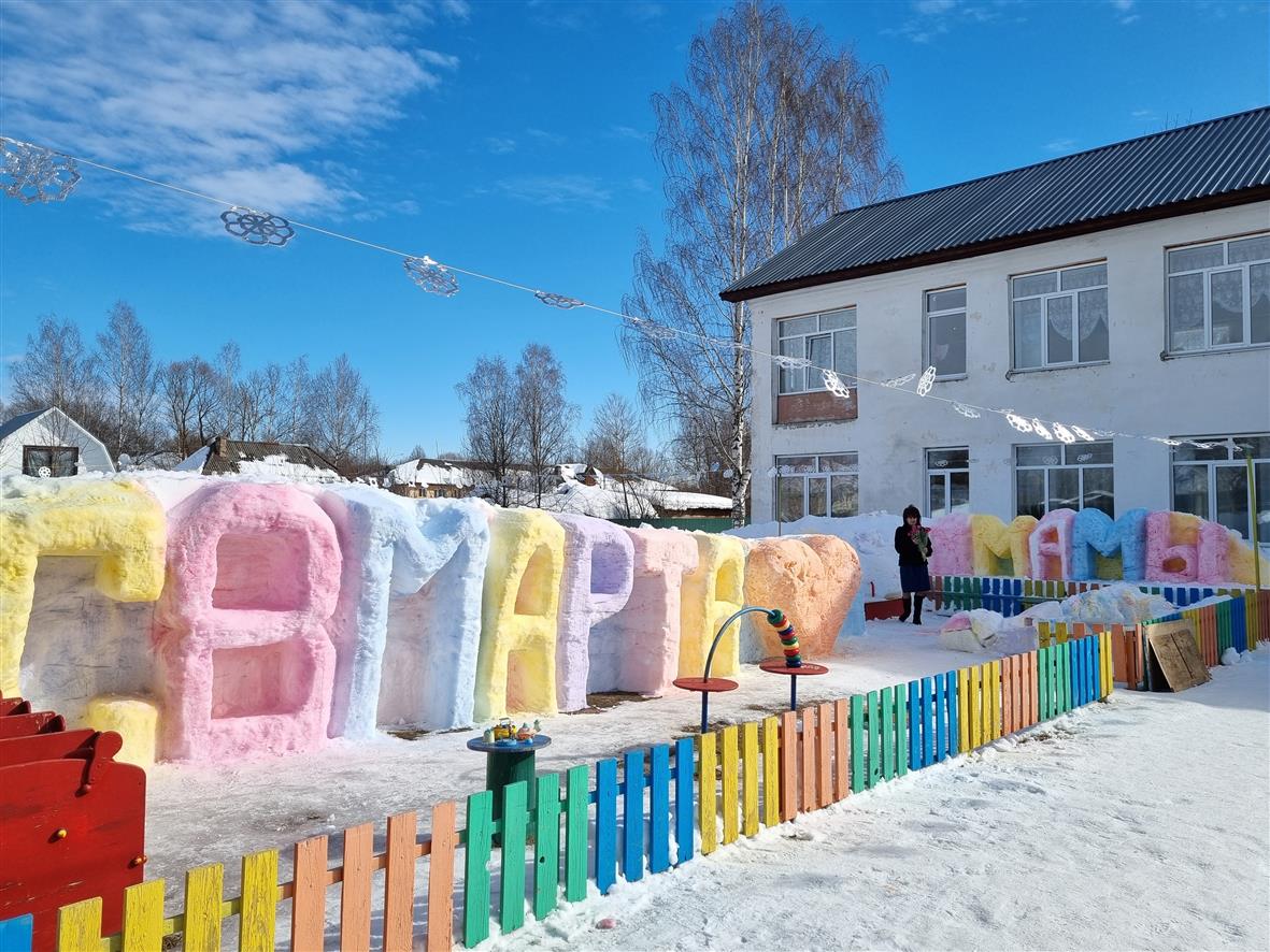 На территории нашего детского сада рабочий по комплексному обслуживанию Белов Кирилл вырезал из снега поздравительную открытку "С 8 Марта!" для прекрасных дам в честь международного женского дня. А так же, подарил всем дамам без исключения тюльпаны!!