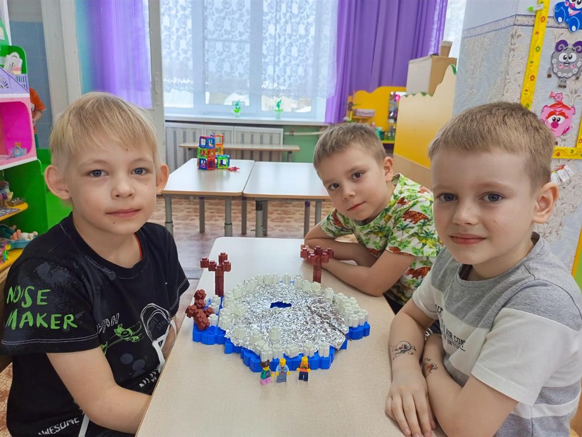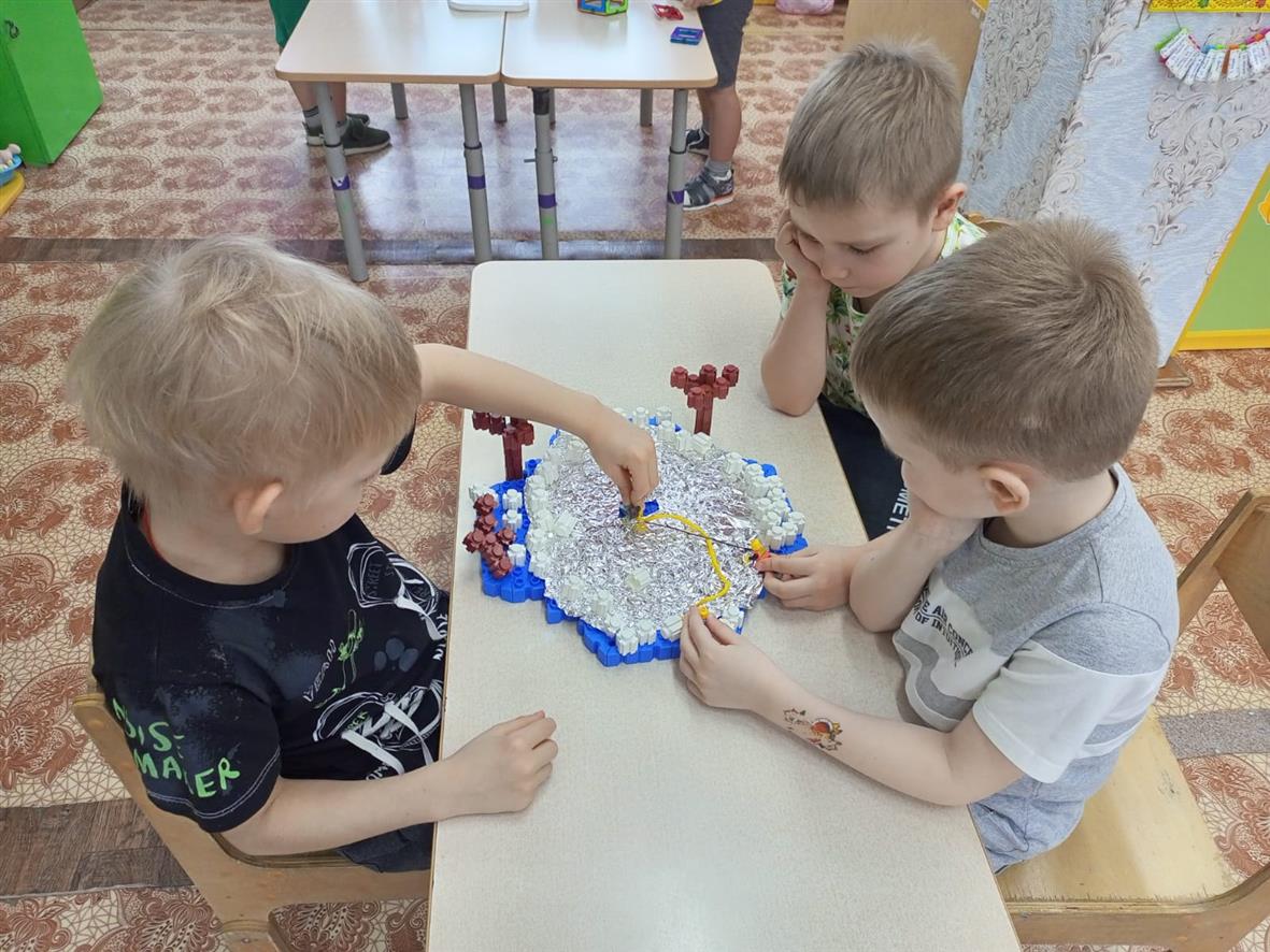 Мальчишки соорудили виртуальный пруд и с помощью человечеков LEGO осваивали профессию спасателя. Спасали не послушного ребенока при помощи веревки и ветки, аккуратно ложась на лёд.
