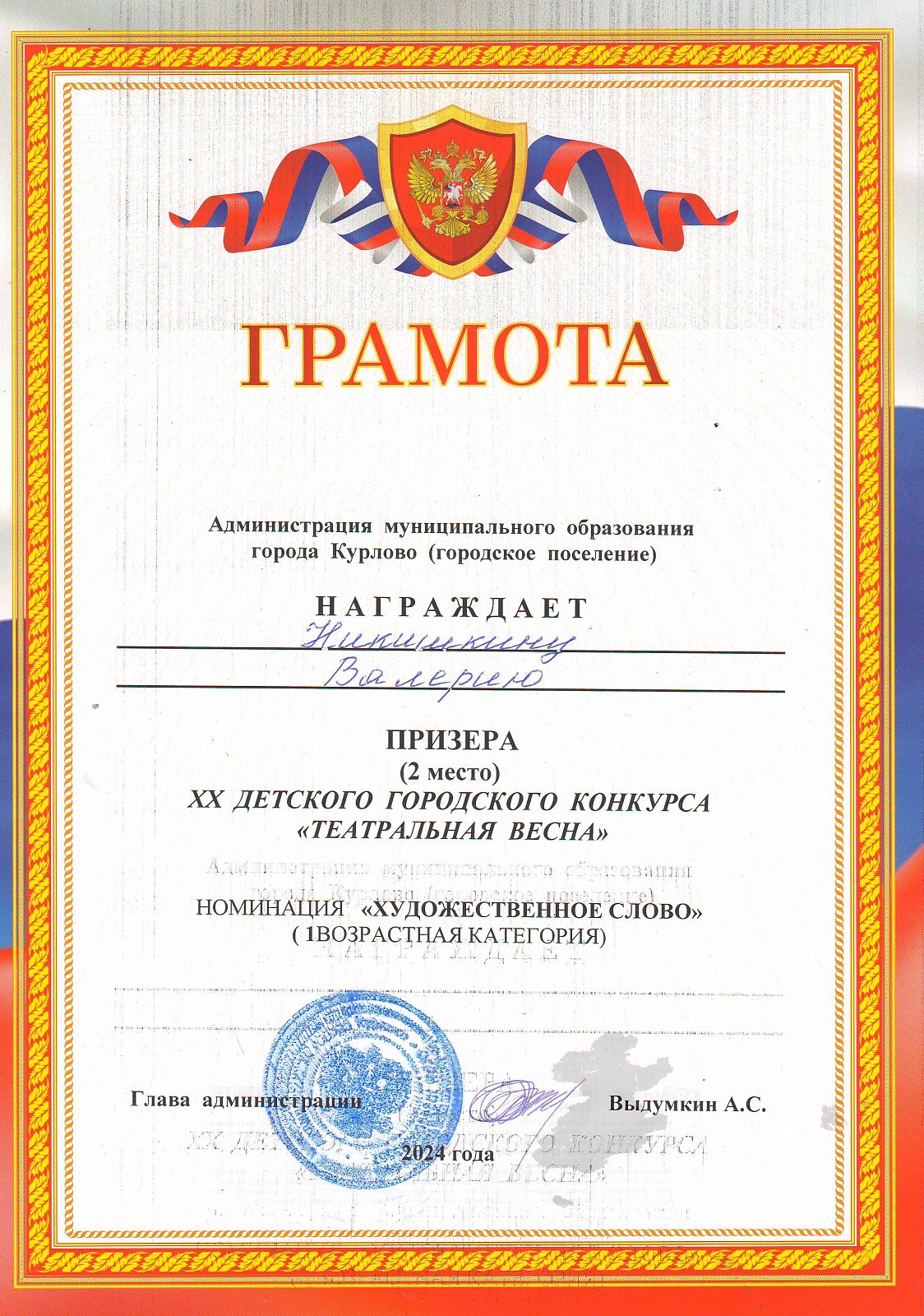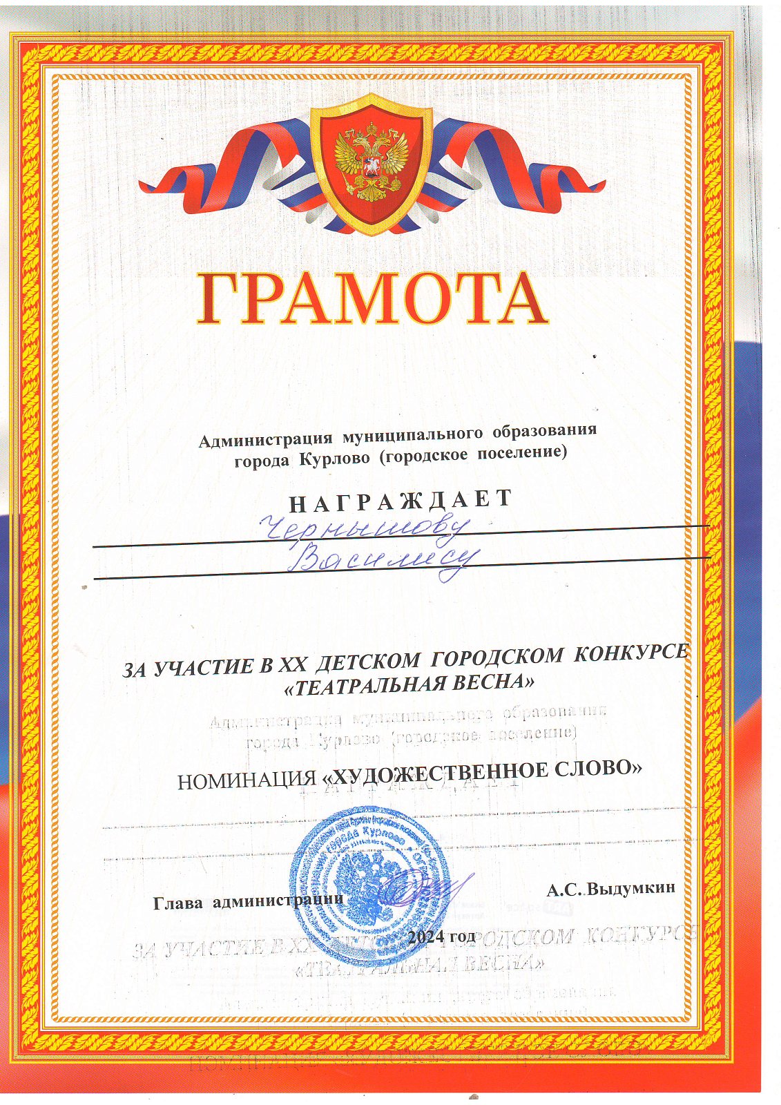 Чернова Василиса - грамота за участие в номинации "Художественное слово".