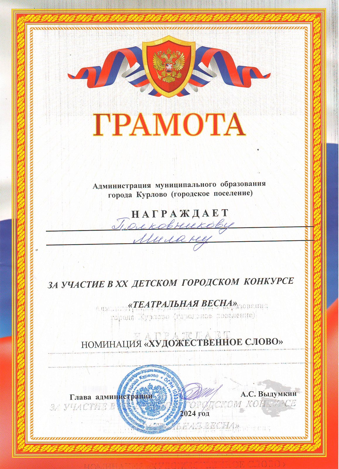Полковникова Милана - грамота за участие в номинации "Художественное слово".