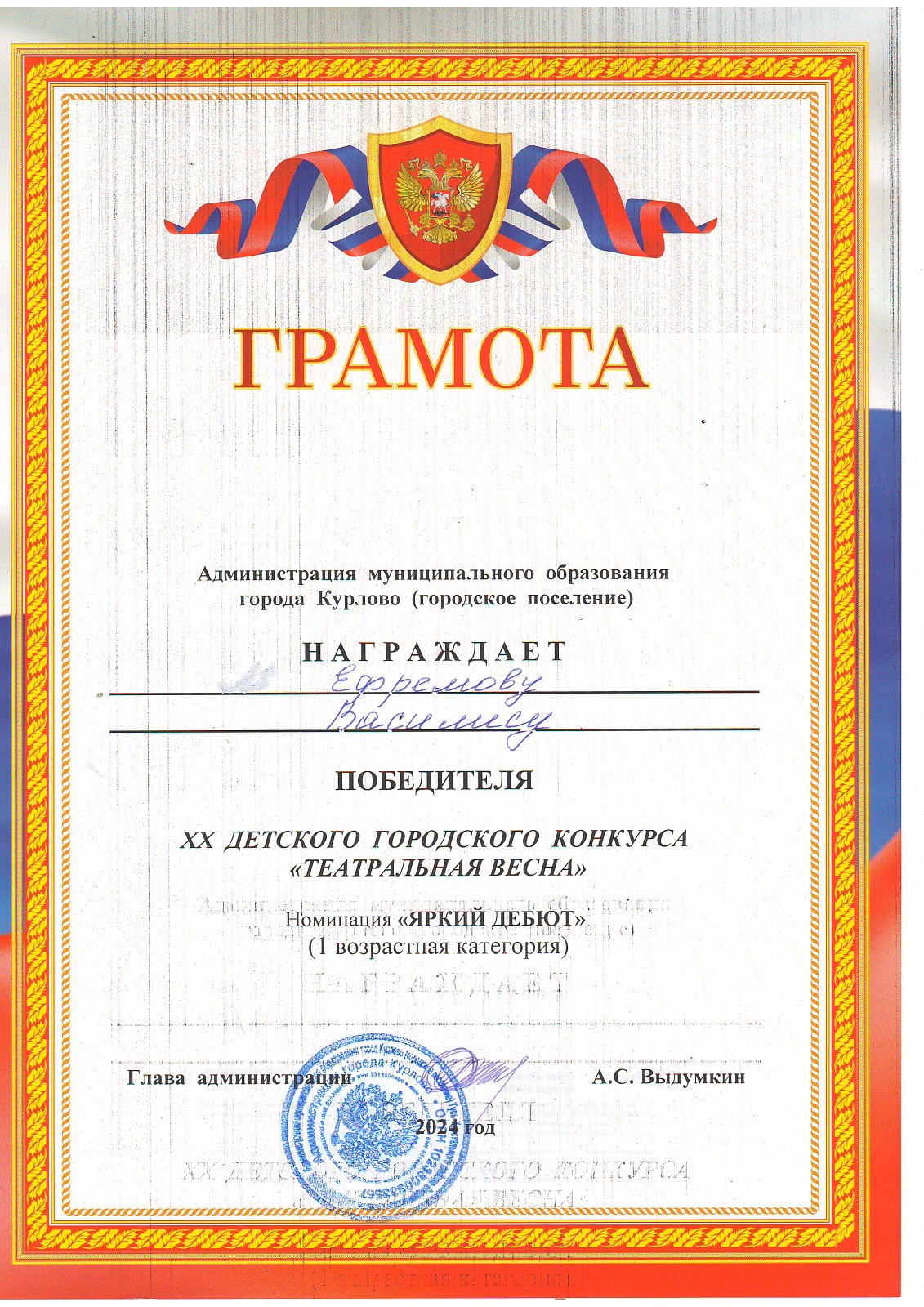 Ефремов Роман- грамота за участие в номинации "Художественное слово".