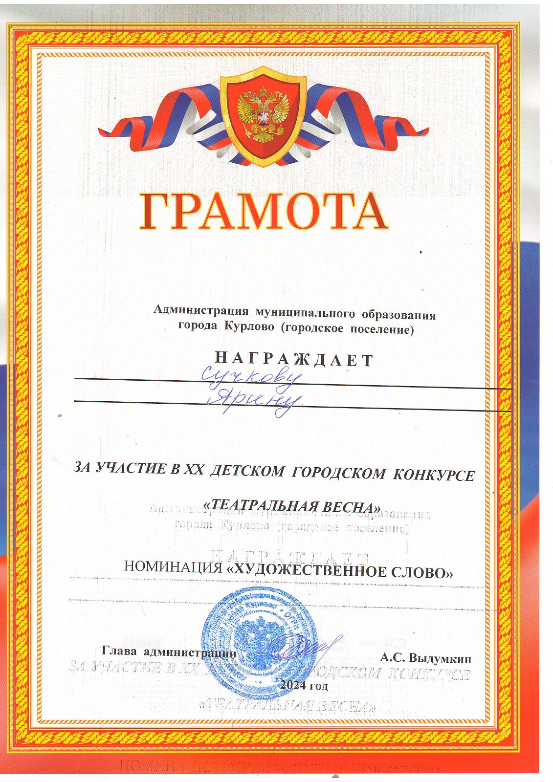 Сучкова Арина - грамота за участие в номинации "Художественное слово".