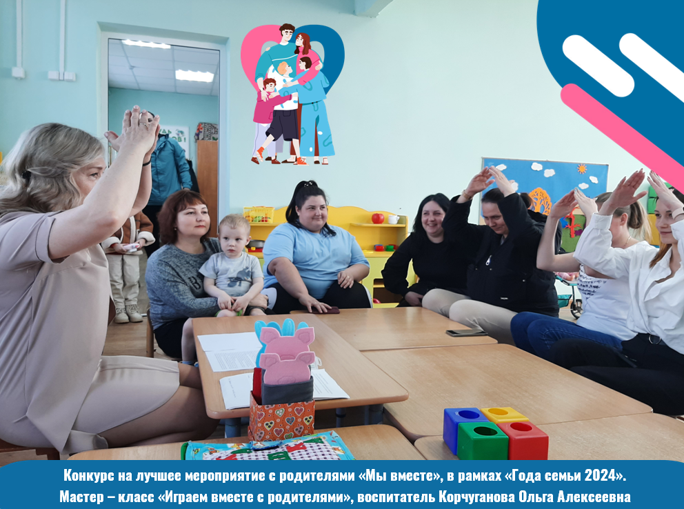В рамках реализации годового плана МБДОУ д/с №3 г. Курлово, с целью внедрения современных форм организации взаимодействия с родителями, способствующих созданию образовательных отношений и развитию педагогической компетентности родителей в соответствии с ФОП и ФГОС ДО, в период с 04.03.2024 г. по 22.03.2024 г состоялся конкурс на лучшее мероприятие с родителями «Мы вместе!».