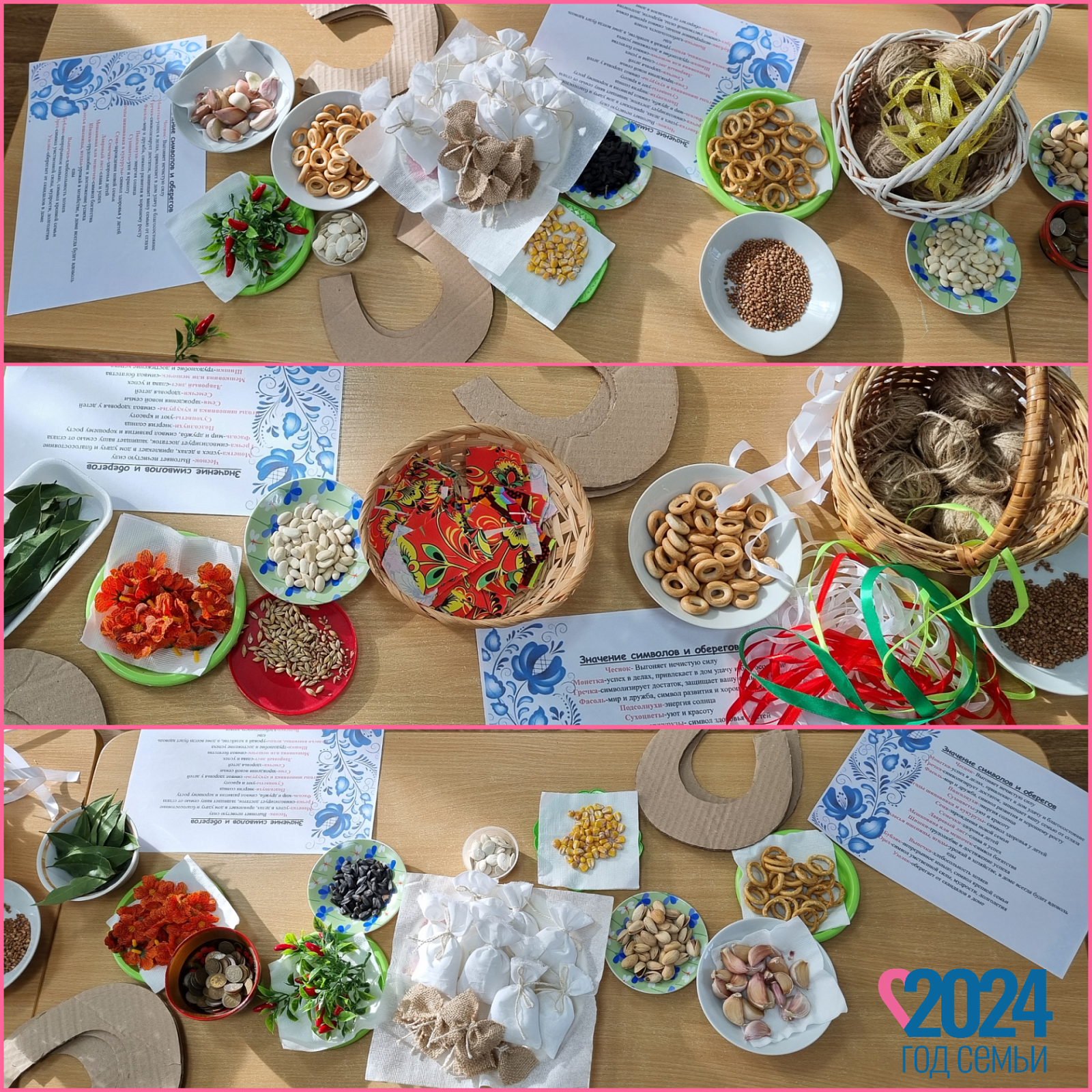 Каждый предмет которым украшали оберег имеет своё значение. Значение символов в обереге лежало у каждого на столе.