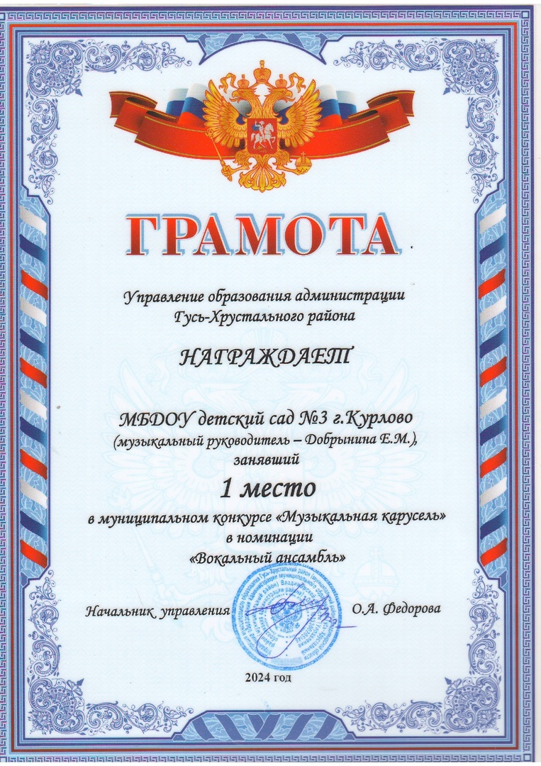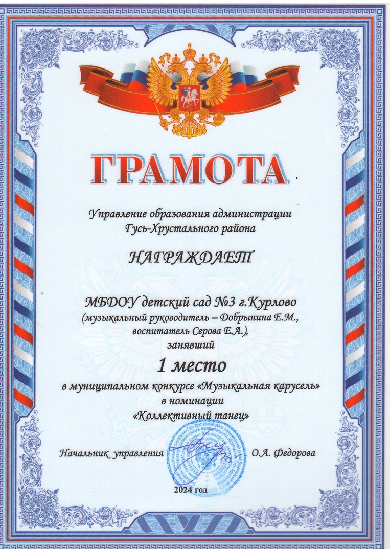 Наш детский сад под руководством музыкального руководителя Добрыниной Елены Михайловны и воспитателя Серовой Елены Александровны стал победителем (1 место) муниципального конкурса "Музыкальная карусель" в двух номинациях: