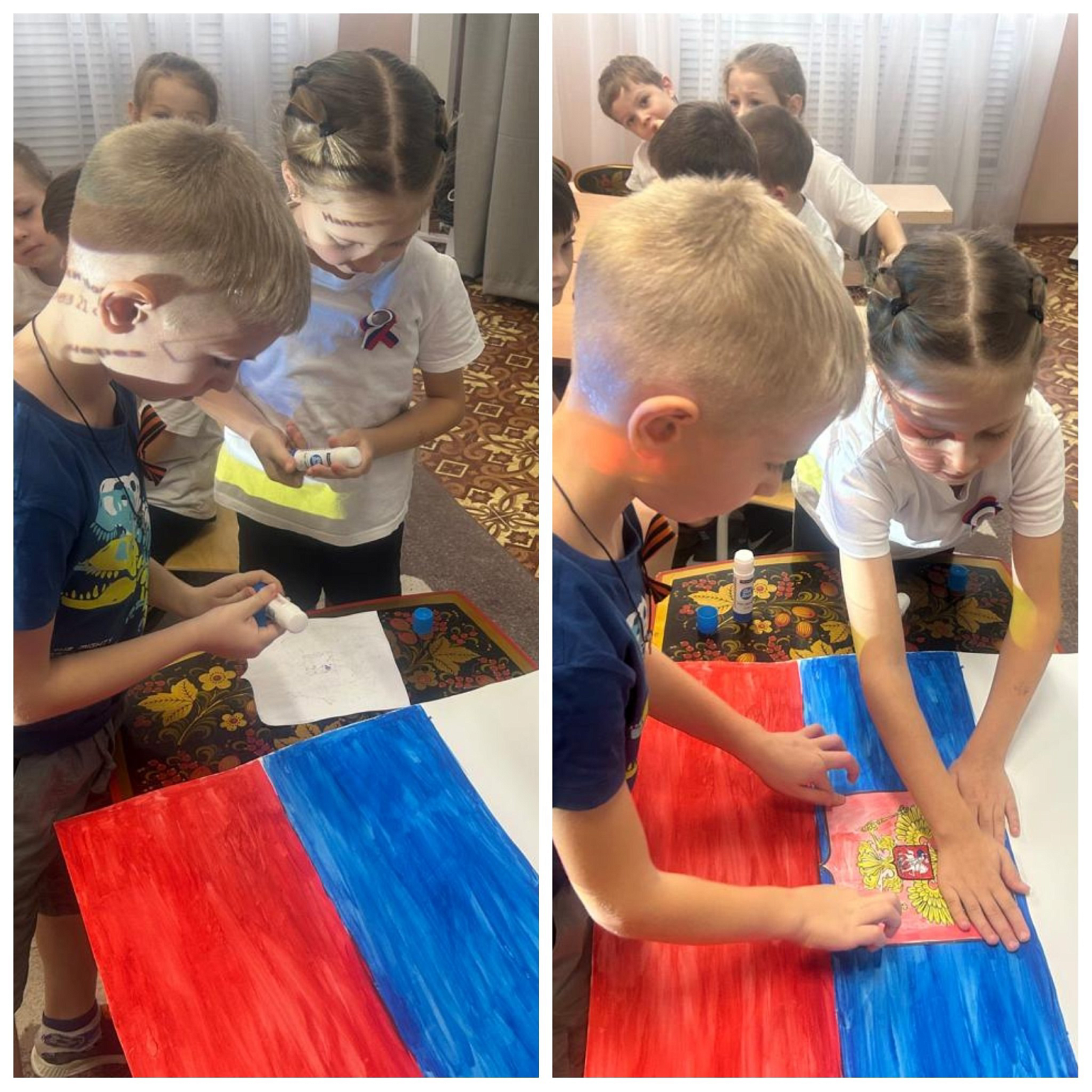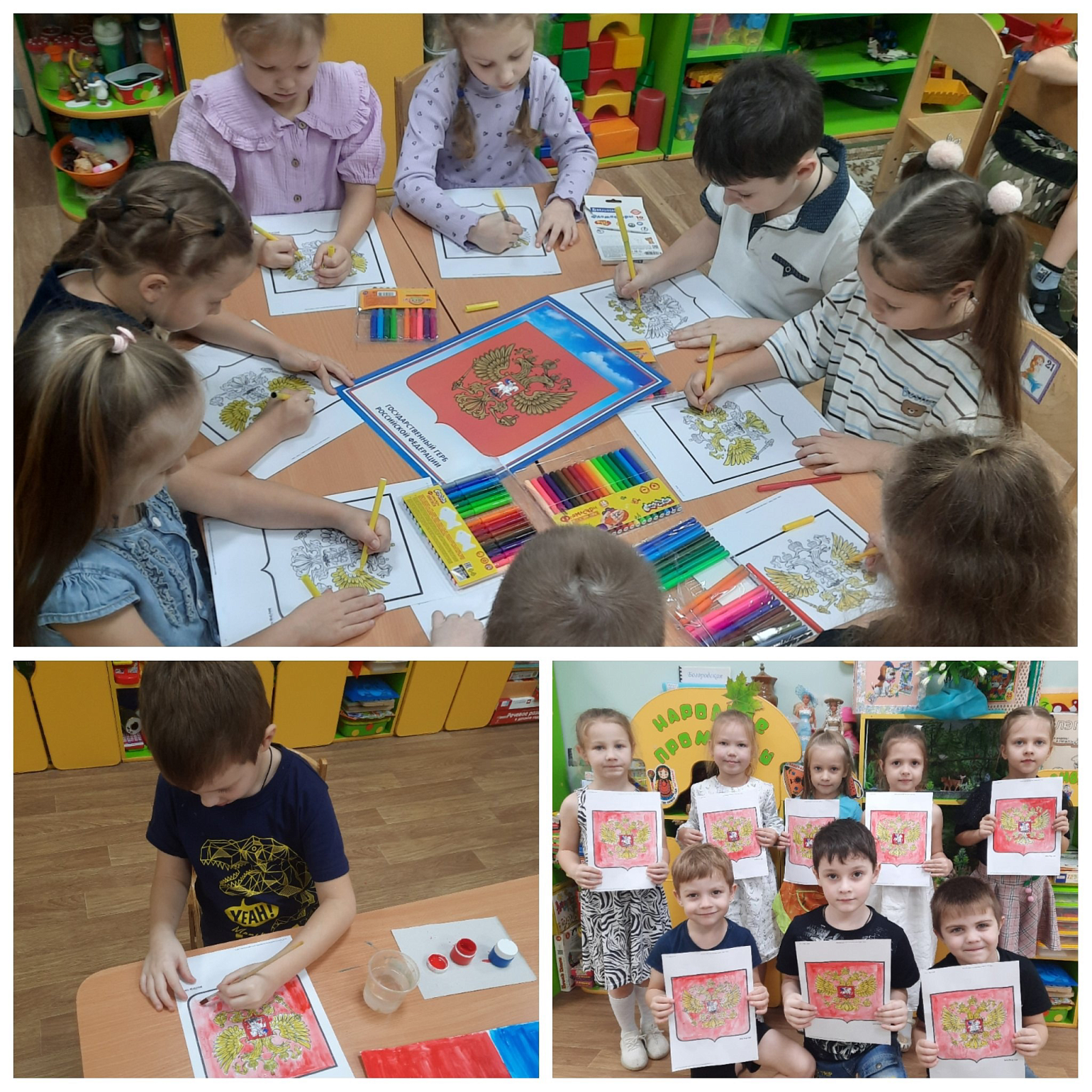 Воспитанники рассказывали стихи о Гербе Российской Федерации, раскрашивали герб России, коллективно рисовали флаг Российской Федерации, наклеивали герб .