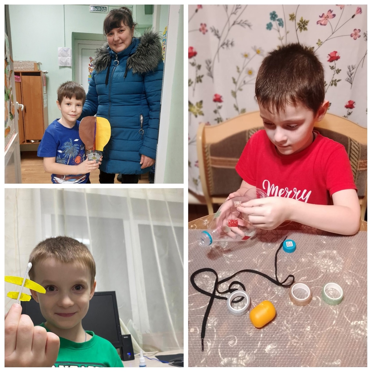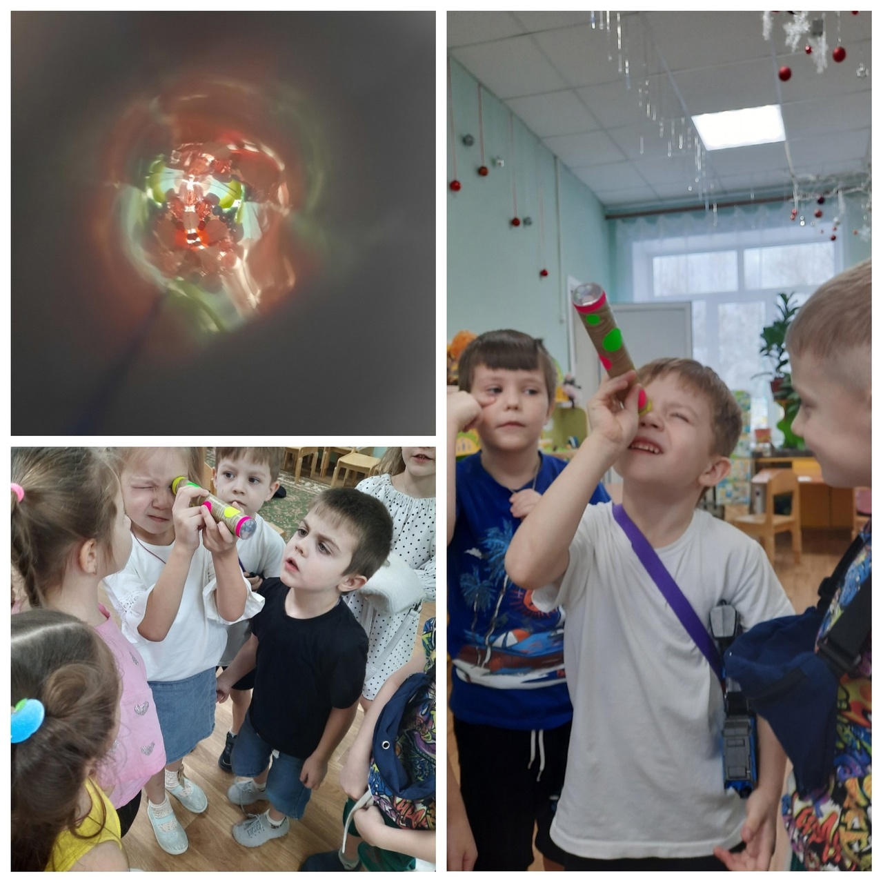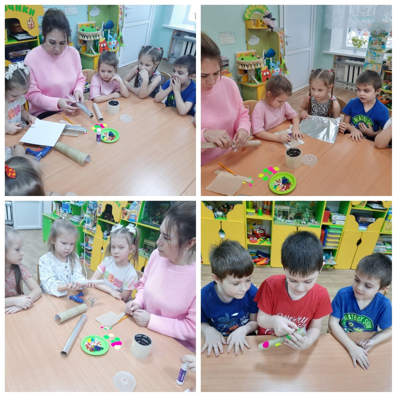 Вместе с ребятами воспитатель Елена Александровна стала изобретателем, и совместно изготовила свой калейдоскоп из бросового материала .