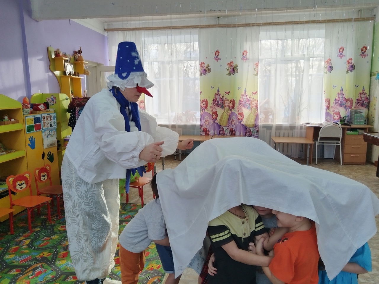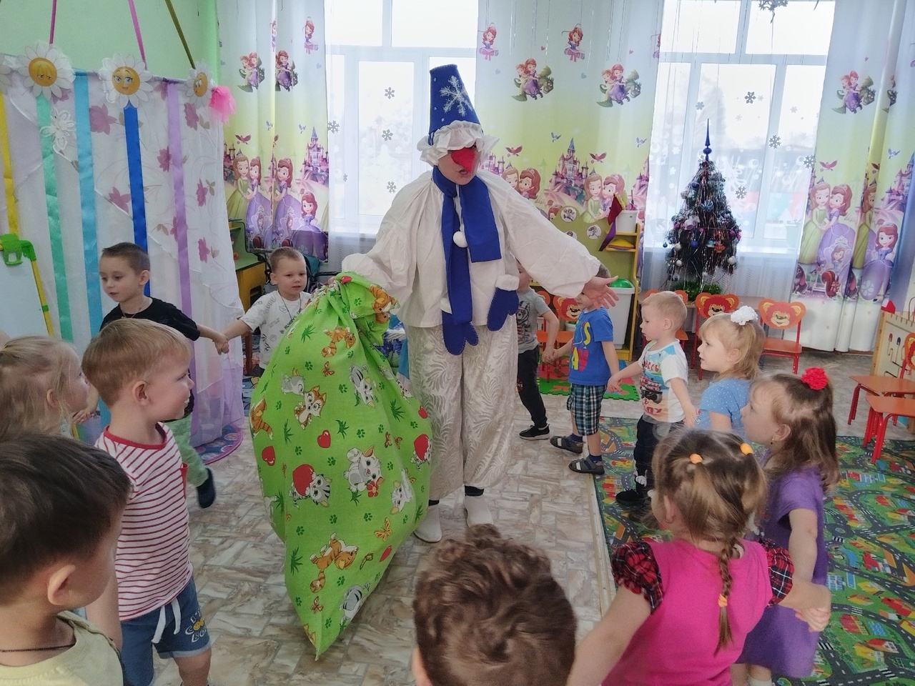 В гости к ребятам приходил Снеговик и принес с собой огромный мешок подарков.