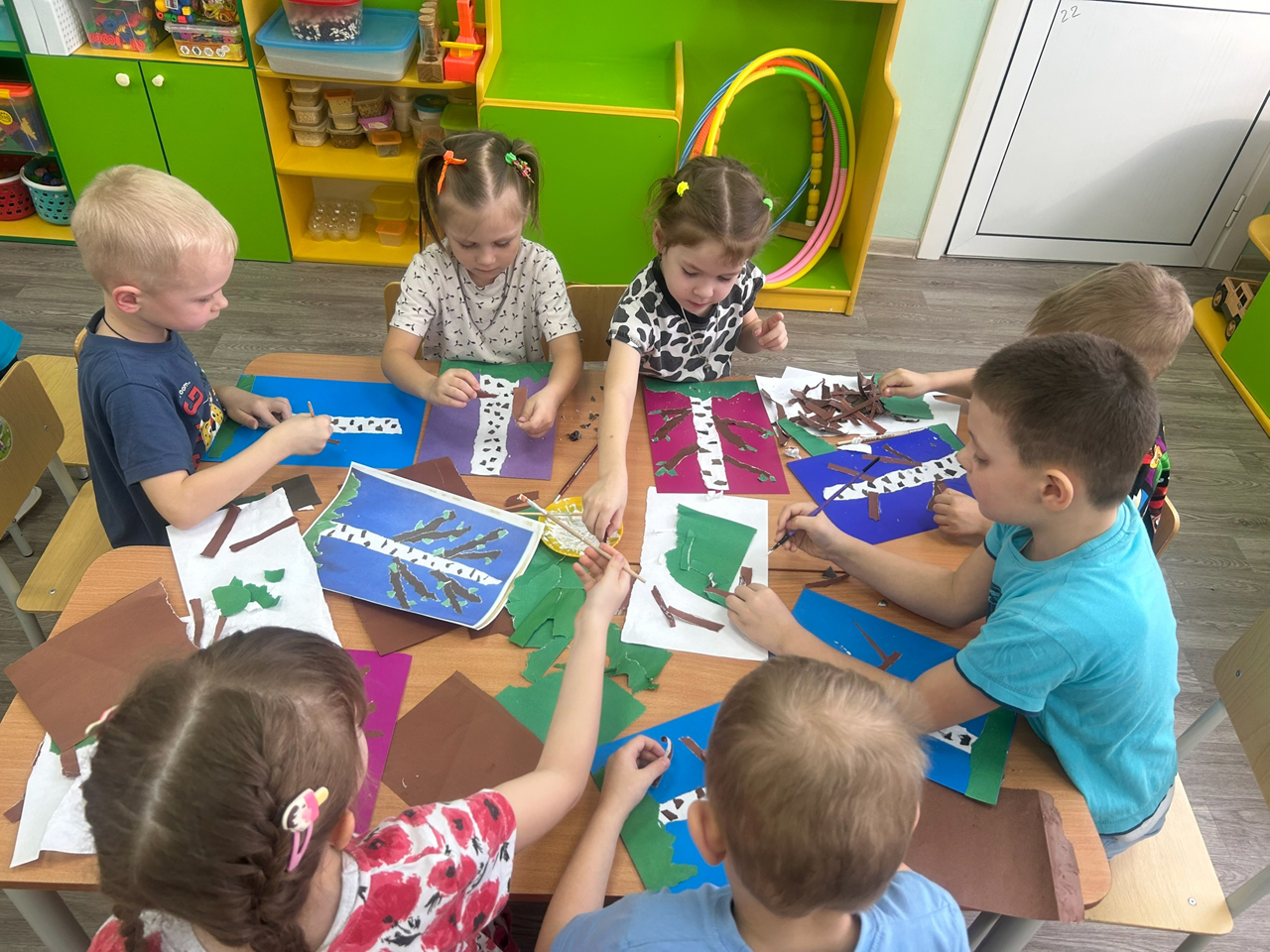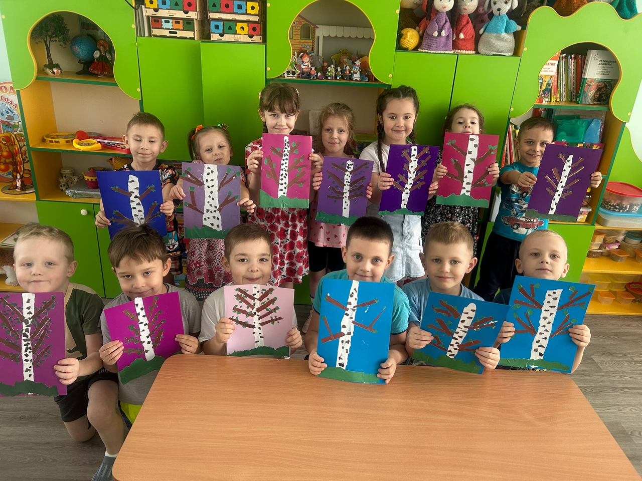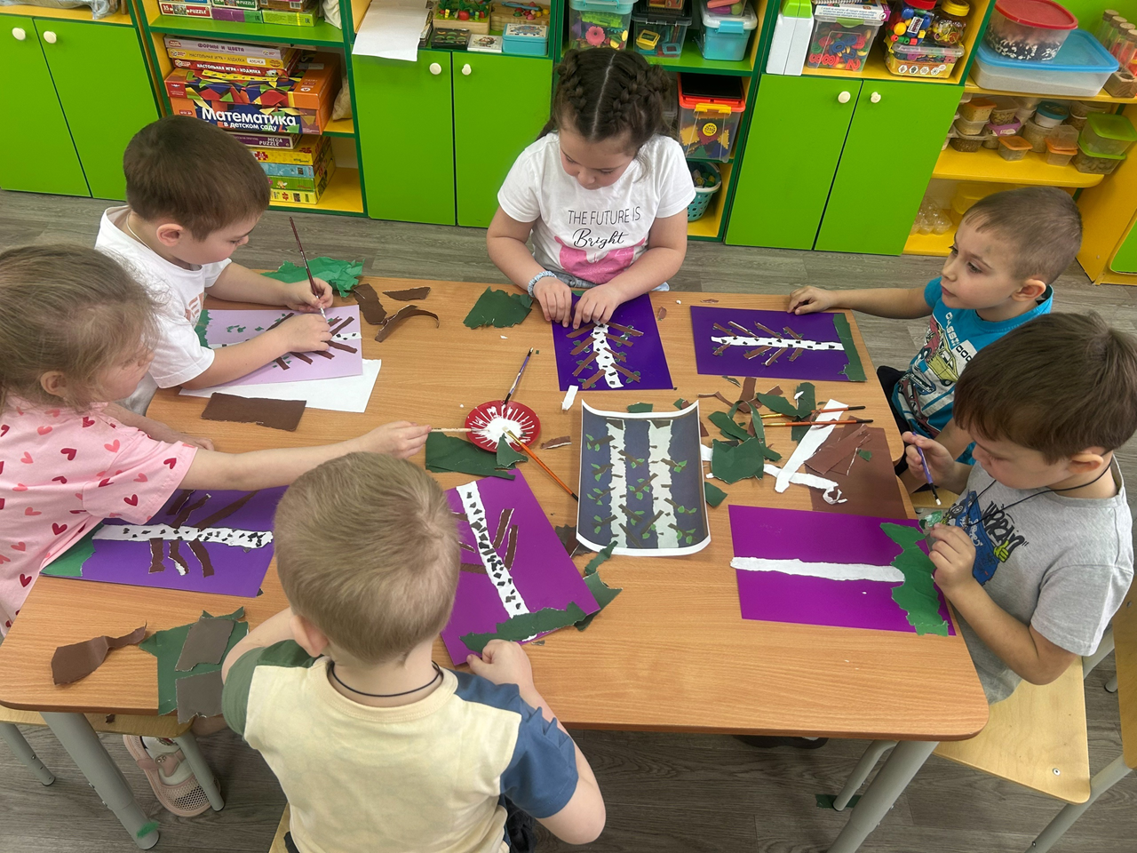 На занятиях по рисованию, лепке и аппликации ребята рисовали деревья, выполнили аппликацию «Берёзка» и лепили из пластилина.