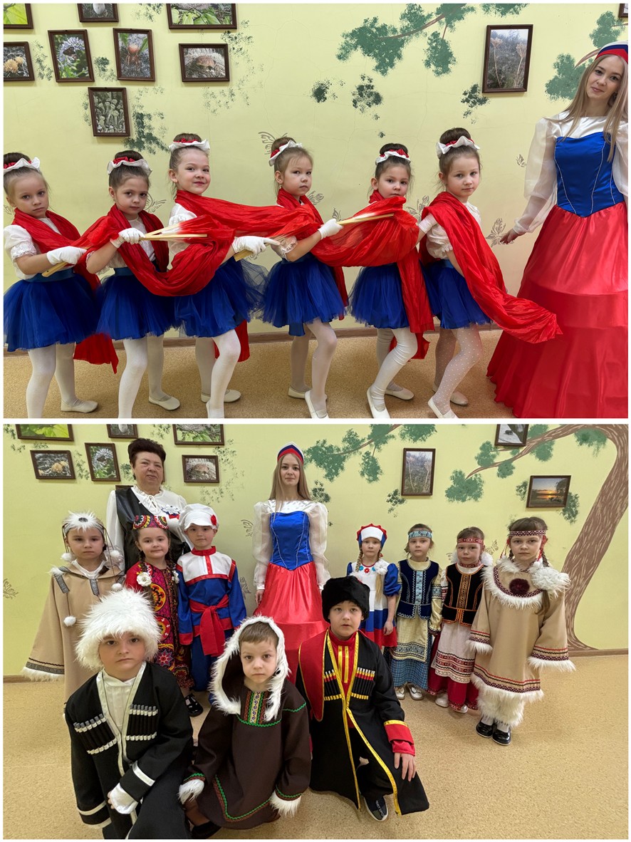 Воспитанницы подготовительной группы «Апельсинки» ярко и красочно исполнили танец «Мы». Воспитанники групп «Ягодки», «Бабочки» и «Апельсинки» продемонстрировали дружбу и единение народов России.