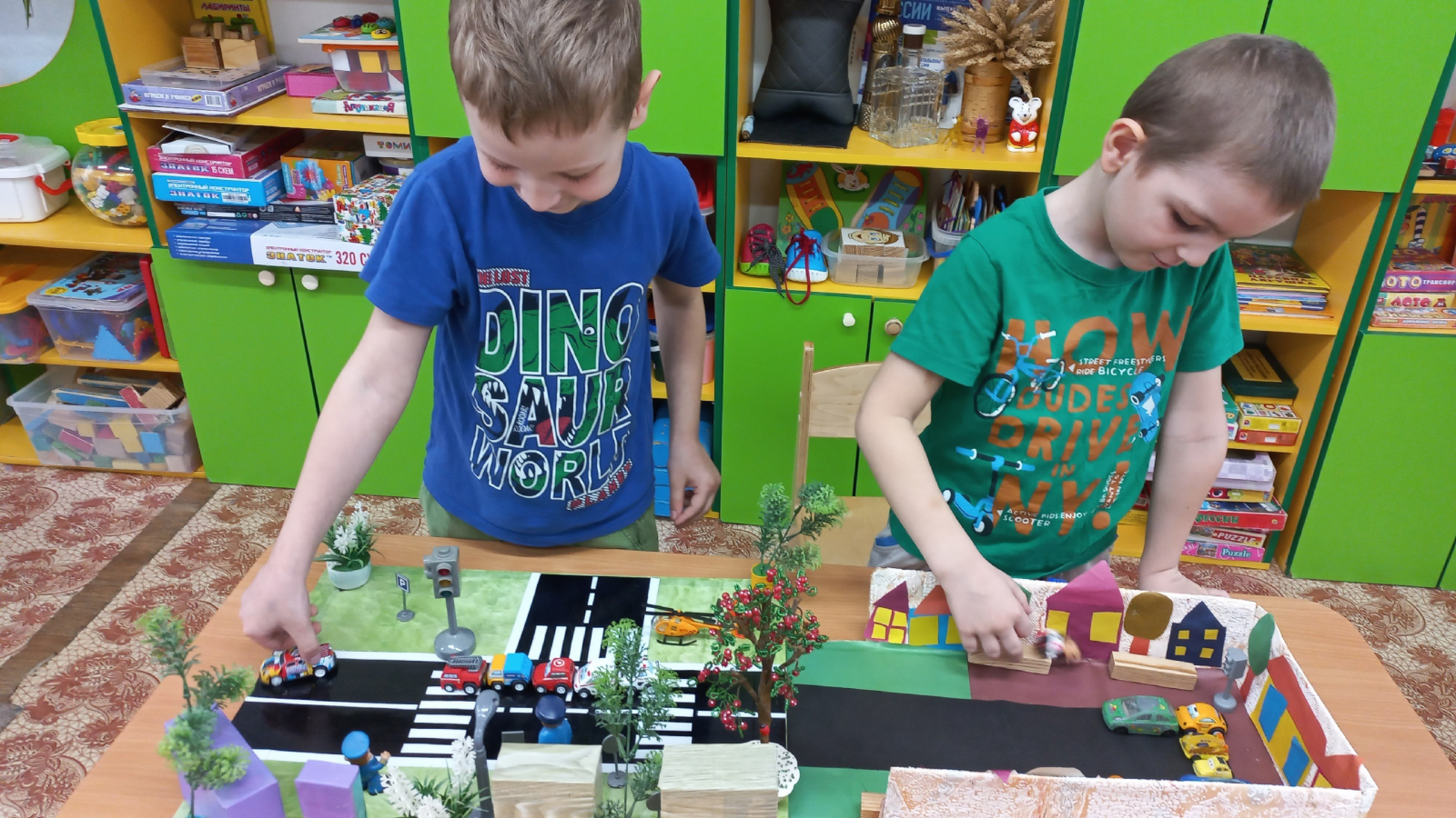 В этом году мы уделяем большое внимание технологии макетирования, поэтому все вместе создавали небольшой макет улицы города, в который дети с интересом играют, придумывают сюжеты.