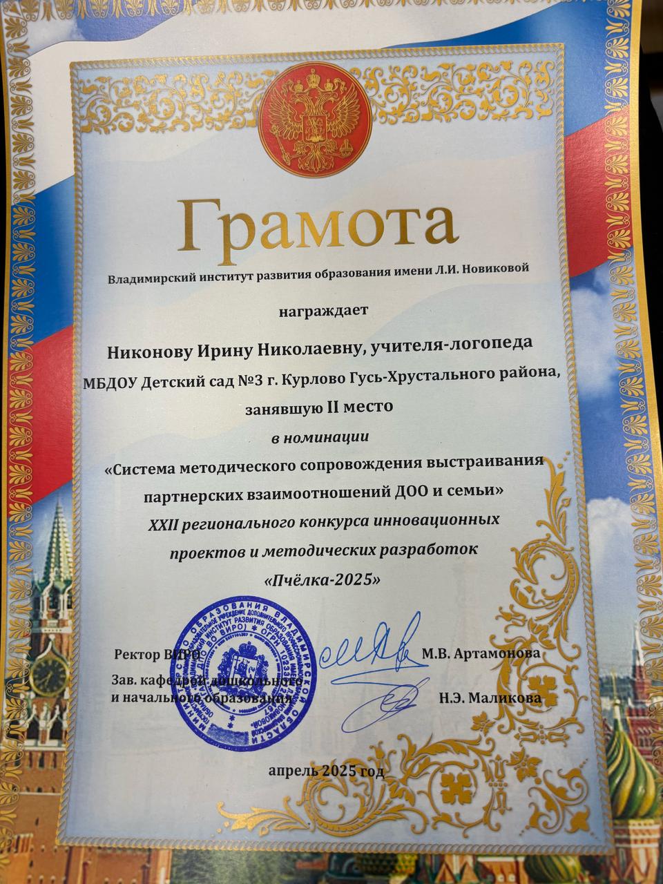 Ирина Николаевна заняла II место в конкурсе в номинации «Система методического сопровождения выстраивания партнёрских взаимоотношений ДОО и семьи».