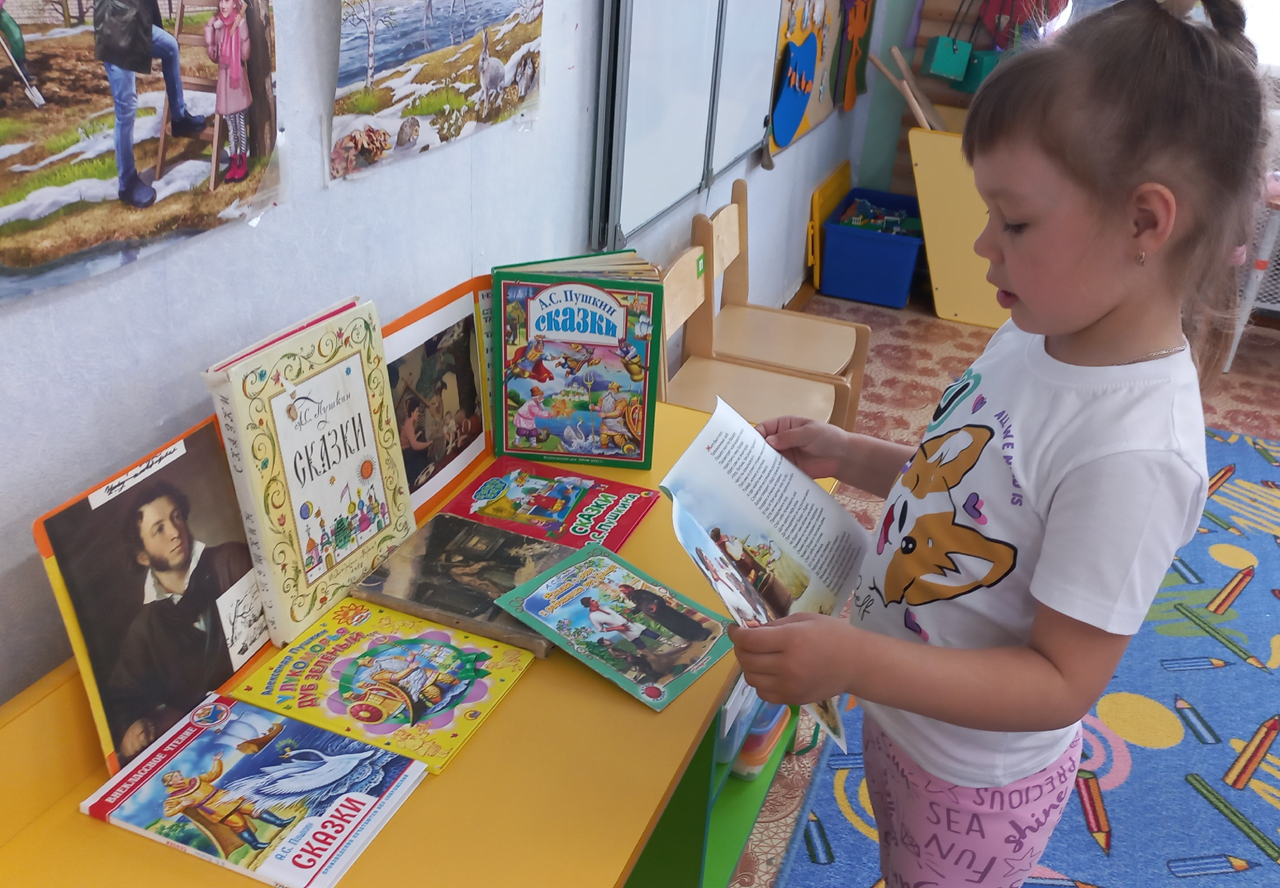 На выставке литературы, с интересом рассматривали книги сказок А.С.Пушкина.