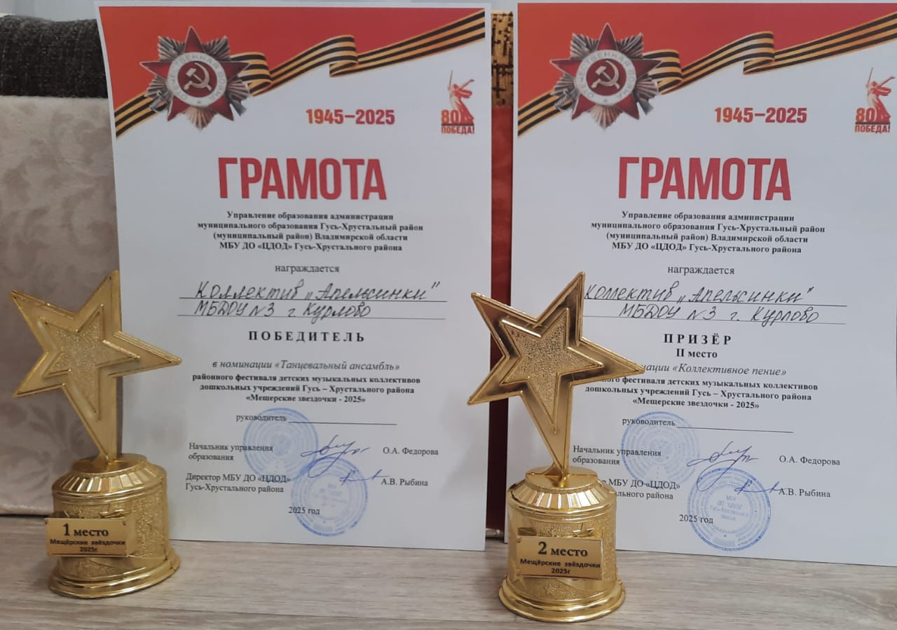 20 мая в МКУК ДК г.Курлово состоялся районный фестиваль детских музыкальных коллективов дошкольных учреждений Гусь – Хрустального района «Мещёрские звёздочки – 2025» в рамках муниципального фестиваля детского творчества «В сердце Мещёры» в честь празднования 80-летия Победы в Великой Отечественной Войне.