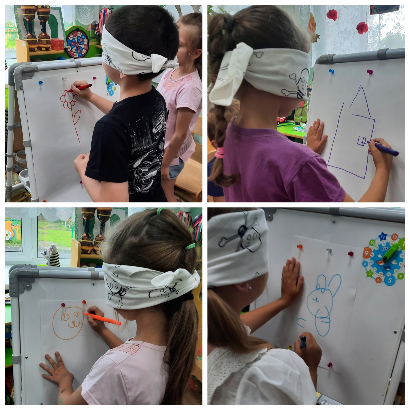 Ребята играли в дидактические игры: «Кто больше назовёт предметов одного цвета », «Найди краски времён года», «Какого цвета бывает», «Рисуем с закрытыми глазами».