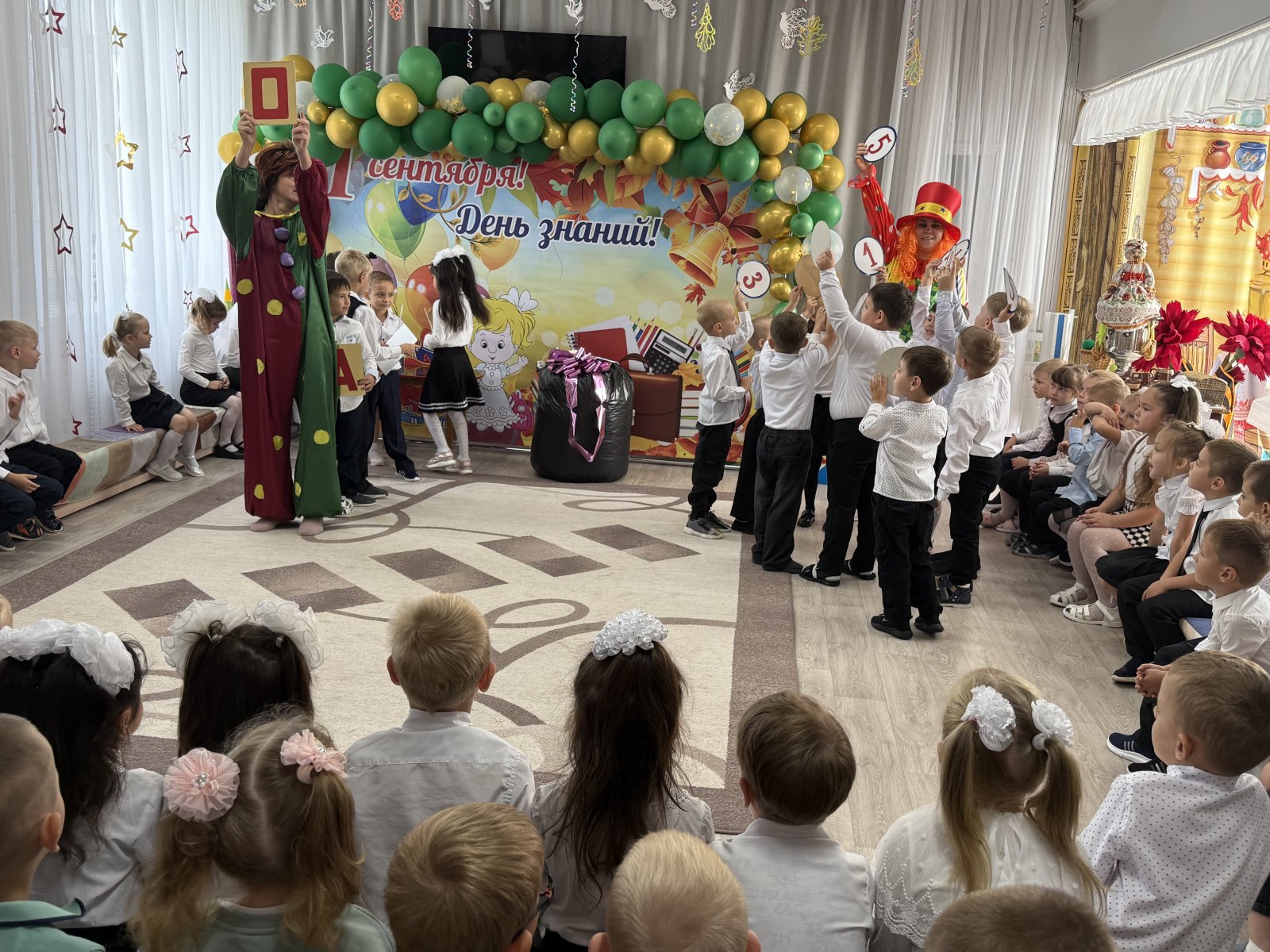 Этот день, открывает новый учебный год: занятия, беседы, праздники; помогающие лучше познать окружающий мир, чему-то научиться, определить свои интересы. Кто-то в этот день впервые пришёл в детский сад, кто-то бежал на встречу со своими друзьями. И сегодня, первого сентября, дети по особенному радовались хорошей погоде и встрече с озорными клоунами Тимошкой и Антошкой!