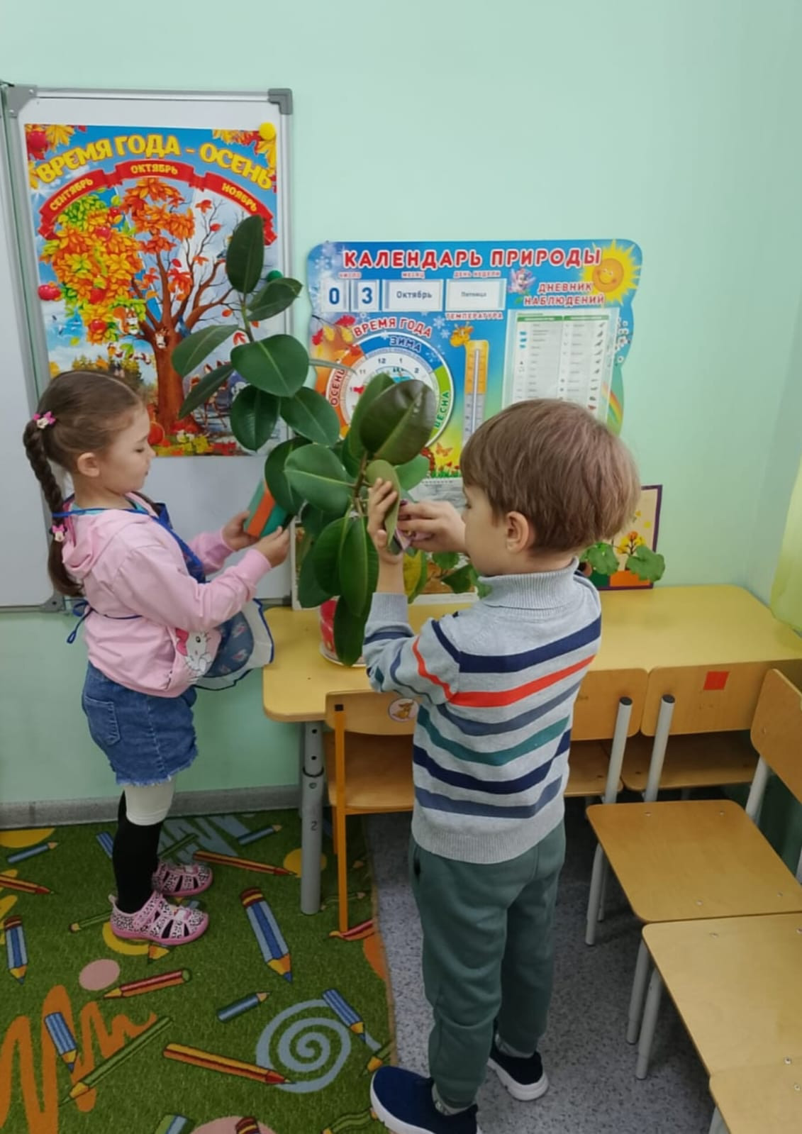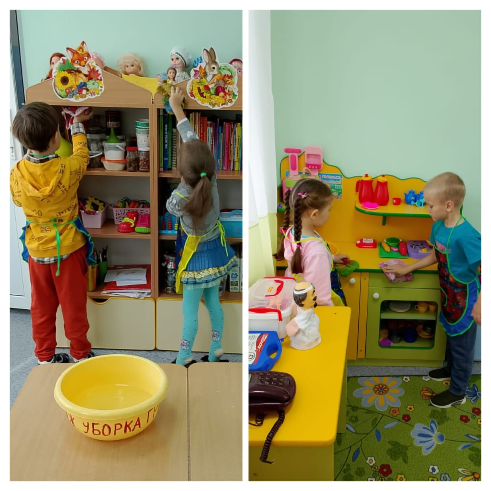 Ребятки вытирают пыль на полочках, ухаживают за комнатными растениями , точат карандашики и убирают игрушки на свои места.