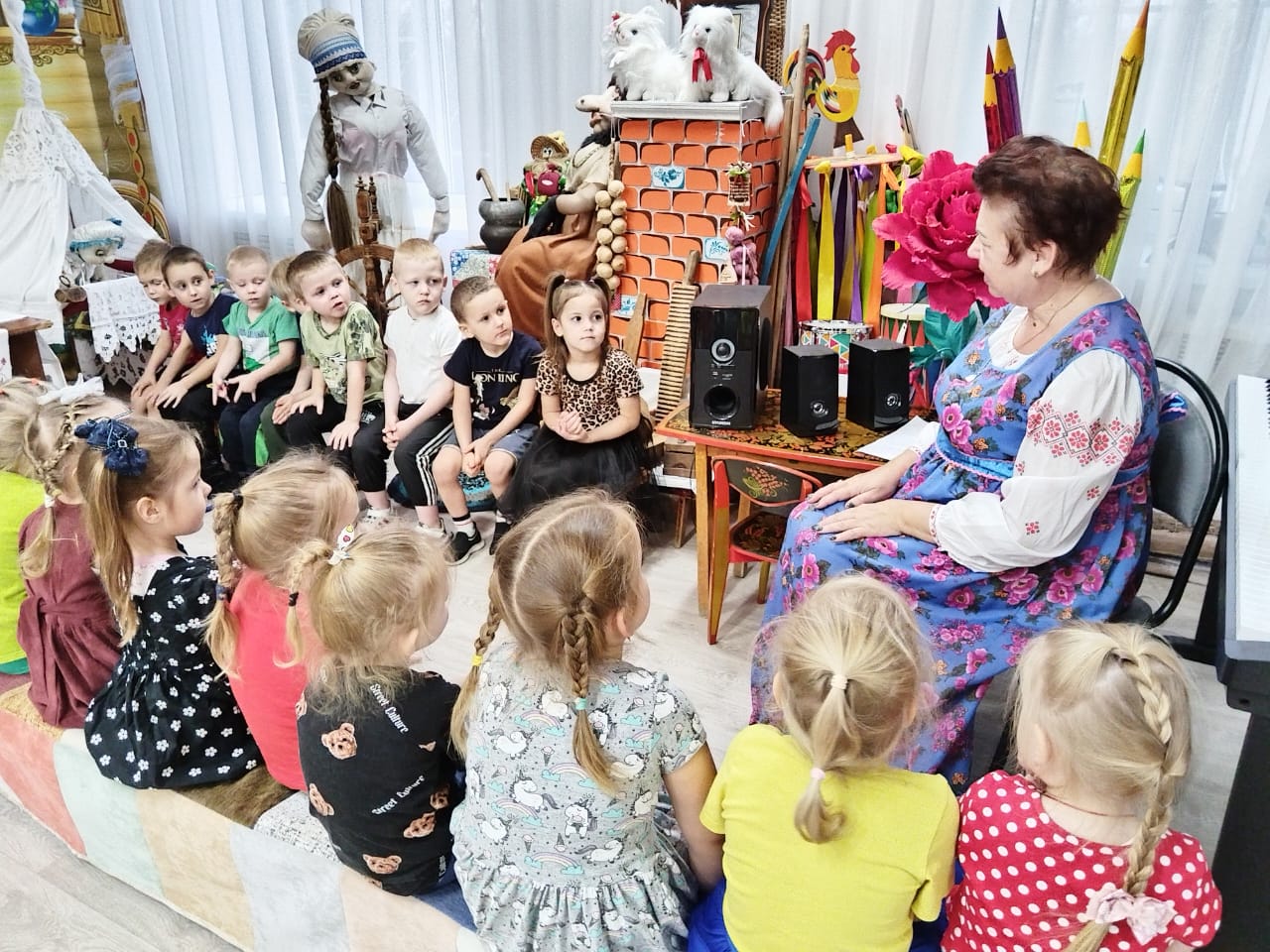 Ребят средней группы «Апельсинки» радушно встретила Хозяюшка в русской избе. Она рассказала о богатстве традиций и обычаев, связанных с Михайловым днём. Воспитанники с интересом слушали истории о том, как в старину люди отмечали этот праздник, какие ритуалы и песни ???? были связаны с ним.