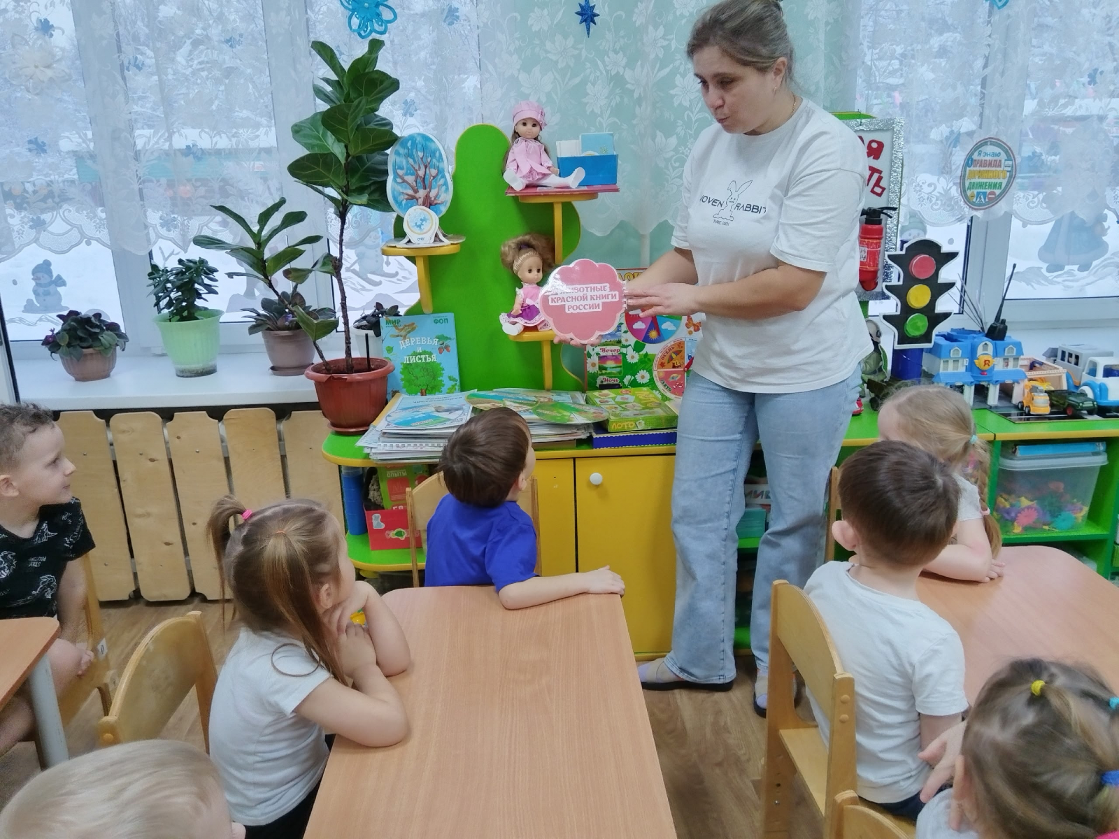 Екатерина Юрьевна рассказала детям о Красной книге — особом списке редких и исчезающих видов животных и растений. Она объяснила, почему некоторые виды находятся под угрозой исчезновения и почему так важно их охранять. Для наглядности были использованы книги и иллюстрации с изображениями редких представителей фауны.